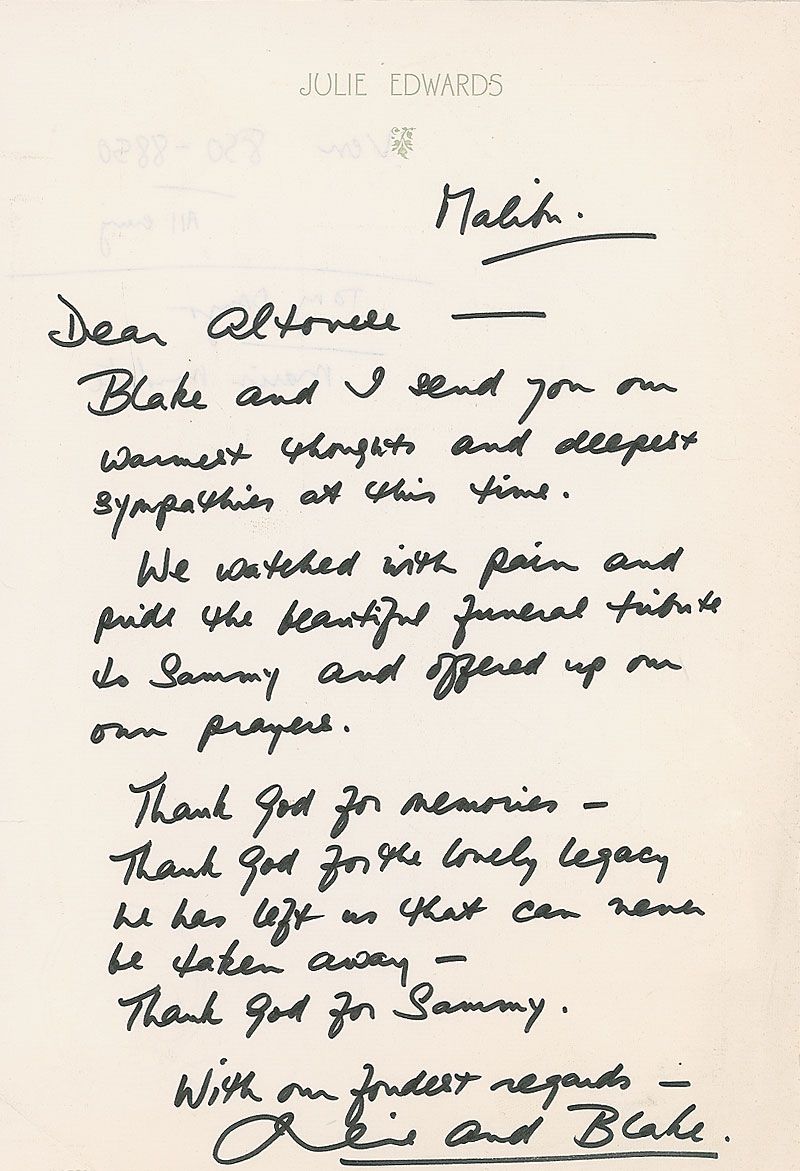 ALS signed “Julie and Blake,” one page, 8.25 x 12, personal letterhead, no date but circa May 1990. Letter offering condolences to Altovise Davis upon the death of her husband, Sammy Davis, Jr. In part: “Blake and I send you warmest thoughts and deepest sympathies at this time. We watched with pain and pride the beautiful funeral tribute to Sammy and offered up our own prayers. Thank God for memories—Thank God for the lovely legacy he has left us that can never be taken away—Thank God for Sammy.” Overall creases and light show-through from notations to reverse, otherwise fine condition.