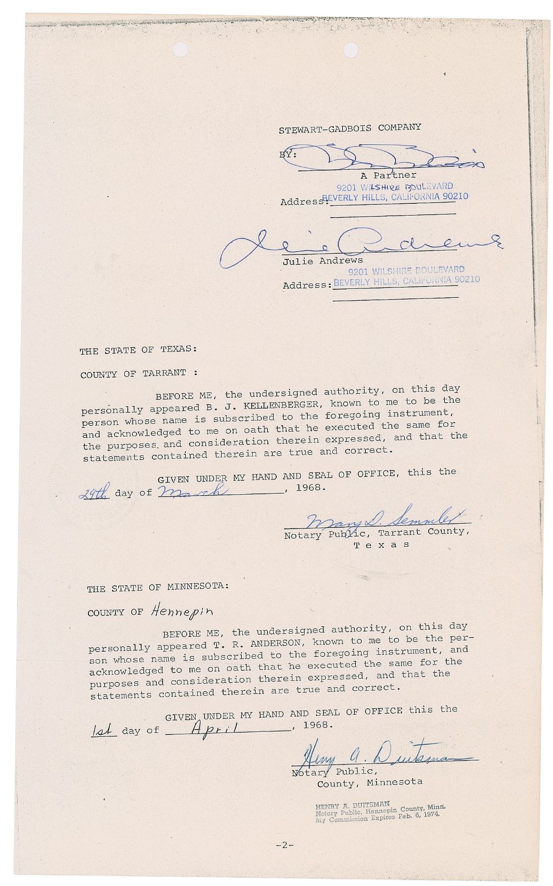 DS, three pages, 8.5 x 14, March 29, 1968. Document relating to an Agreement of Limited Partnership between B. J. Kellenberger as general partner, and T. R. Anderson and the Stewart–Gadbois Company as limited partners, in which Julie Andrews, who was previously named as an additional limited partner, affirms that she "acquired no interest in any of the partnership assets or in the income therefrom which said partnership held prior to January 1, 1967." Signed on the second page in blue ballpoint by Andrews. In fine condition.
