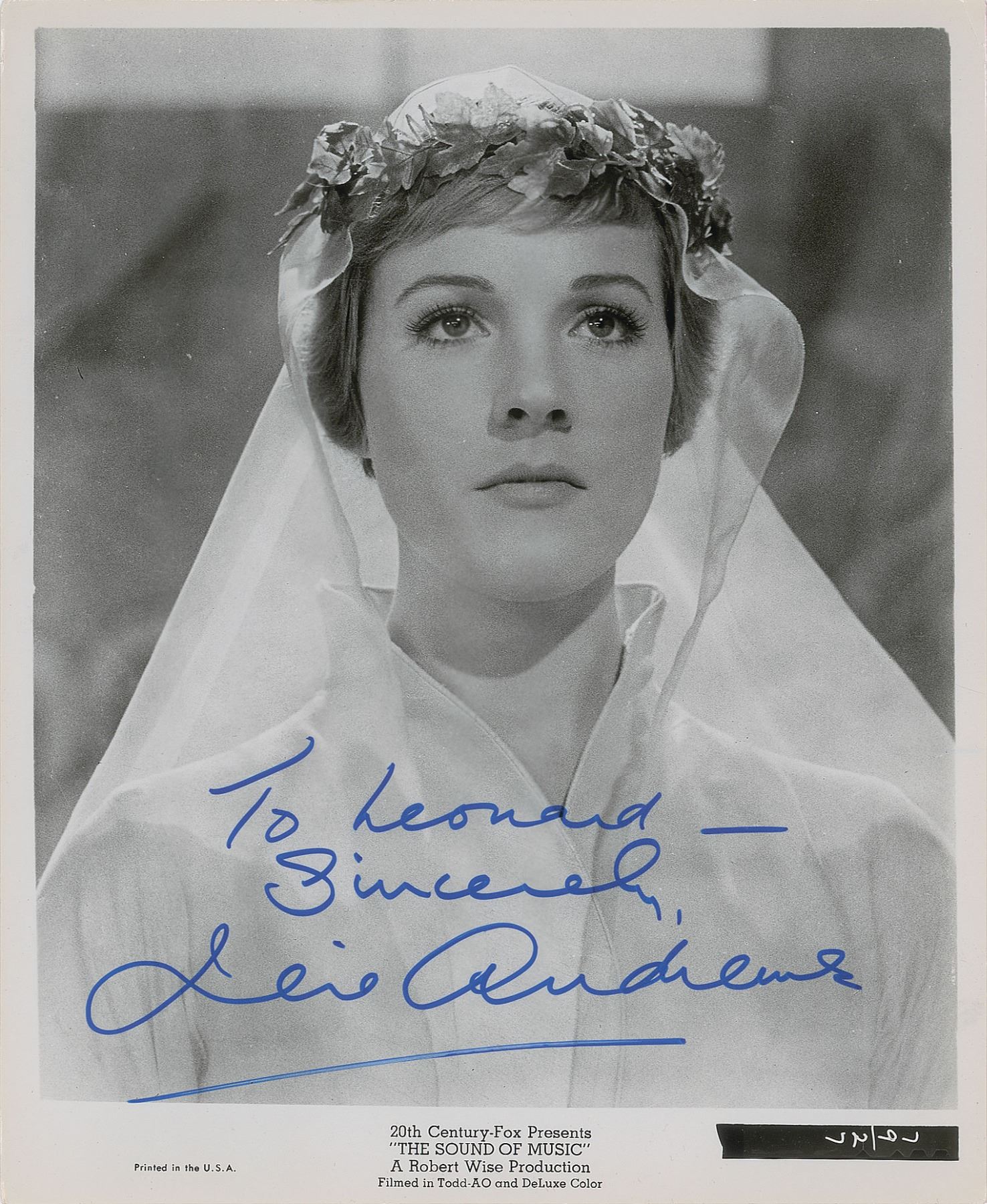 Lovely glossy 8 x 10 Twentieth Century-Fox publicity photo of Julie Andrews as Maria von Trapp from the 1965 musical drama The Sound of Music, signed and inscribed in blue felt tip, "To Leonard—Sincerely, Julie Andrews.” In fine condition, with scattered small creases.