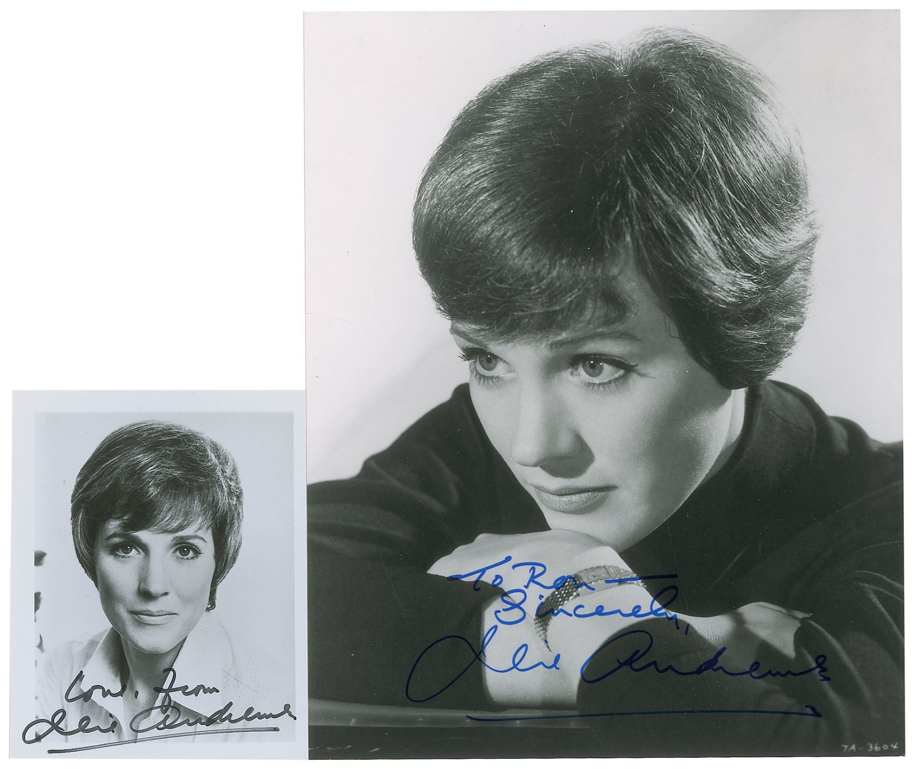 Two photos of Julie Andrews, matte-finish and glossy, 4 x 5 and 8 x 10, both signed in blue or black felt tip, with the glossy photo inscribed "To Ron." In overall fine condition.