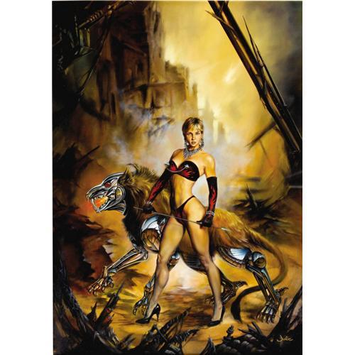 <B>Julie Bell - Heavy Metal May, 1992 Cover Painting Original Art (Heavy Metal, 1992).</B></I> Julie Bell has created a sizzling and sexy cover, showcasing the ultimate fantasy <I>femme fatale</B></I> -- a deliciously decadent dominatrix! Julie also has included a cyborg version of a wolf, one of her favorite creatures to paint. <I>Hey, now!</B></I> This painting has an image area of 17.5" x 25". The art has been professionally framed, and is in Excellent condition.<BR><BR><b>Shipping:</b> Framed (<a target="_blank" href="http://www.heritageauctions.com/common/shipping.php">view shipping information</a>)