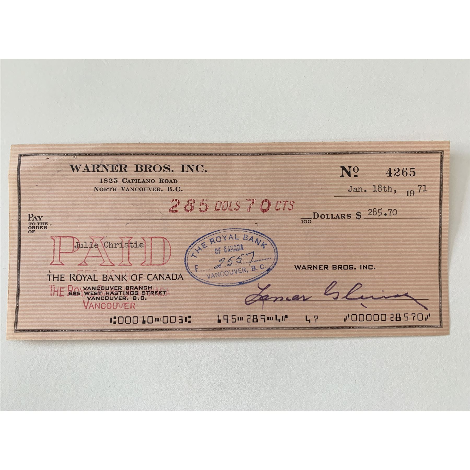 Julie Christie signed check