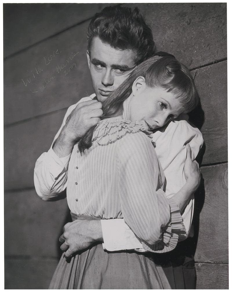 Glossy 11 x 14 photo of Harris being held by James Dean, signed in silver ink, “With love, Julie Harris, 2009.” In very fine condition.