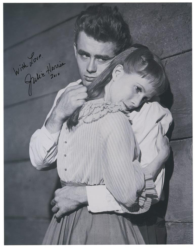 Glossy 11 x 14 photo of Harris being held by James Dean in East of Eden, signed in black felt tip, “With Love, Julie Harris, 2010.” In very fine condition.