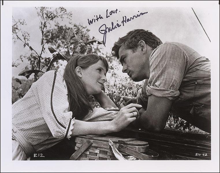 Glossy 10 x 8 photo of Harris and James Dean in East of Eden, signed in black felt tip, “With Love, Julie Harris.” In very fine condition.