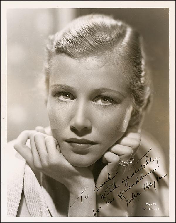 Vintage glossy 8 x 10 close-up photo, signed and inscribed in-person in fountain pen “To Saul, With gratitude for his friendliness, Julie Haydon.” Reverse of photo bears collector’s stamp date of October 22, 1935, the date the signature was acquired. In fine condition, with some scattered light creases and surface marks and a small tear to left edge. The Saul Goodman collection.