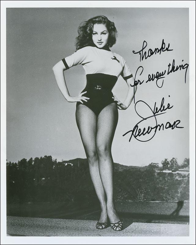 Two signed 8 x 10 photos: a glossy photo of Newmar as Catwoman, signed in black felt tip, “You’re purr…fect, Julie Newmar”; and a glossy photo of Newmar in fishnet stockings, signed in black felt tip, “Thanks for everything, Julie Newmar.” In fine condition.