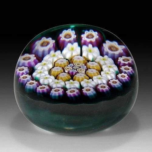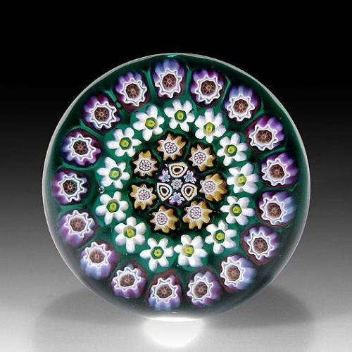 Julie Scrutton Lewis 1998 concentric millefiori paperweight, with complex canes in amber, lavender, and white, including one ring of edelweiss canes, on translucent green ground. Signed/dated. Edition #18 of a limited edition of 25. Diameter 2 3/8".