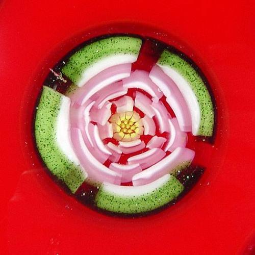 Julie Scrutton Lewis 1999 spaced millefiori on red color ground paperweight. A central Clichy-style rose cane, with soft-pink petals and green aventurine sepals, is encircled by a spaced ring of six asssorted complex canes, on opaque red ground. Signed/dated. Edition #2 of a limited edition of 10. Diameter 2 1/4".