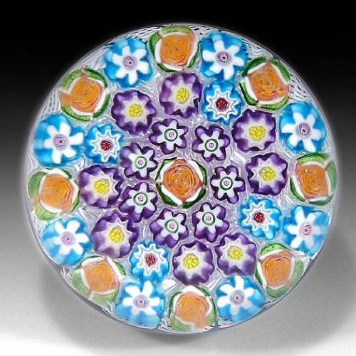 Julie Scrutton Lewis 1999 butterscotch roses and concentric millefiori paperweight. The piece is composed of assorted complex canes, including pastry mold, edelweiss, and rose canes, around a central butterscotch rose, on white upset muslin. Signed/dated. Edition #8 of a limited edition of 10. Diameter 2 3/8".