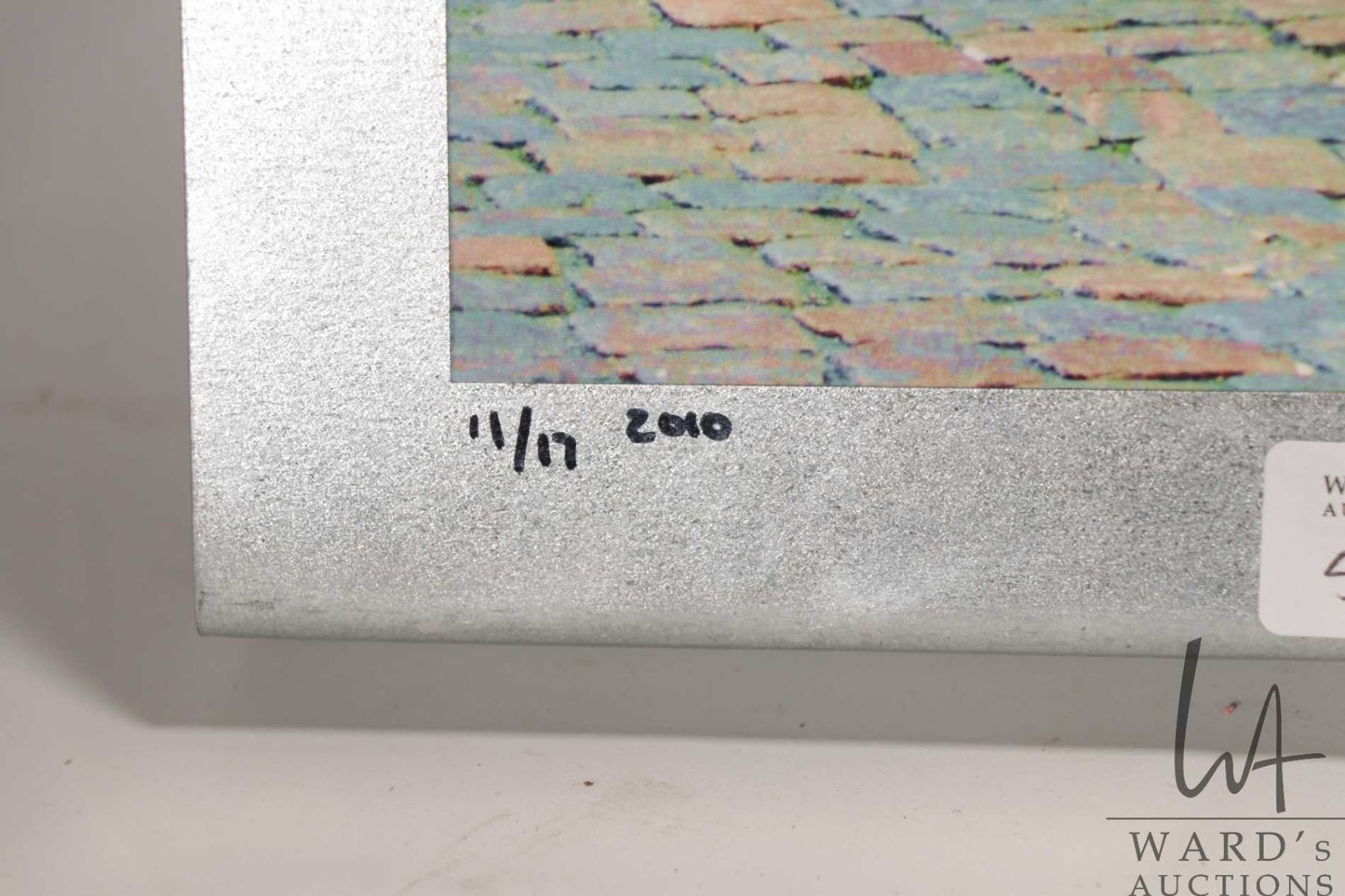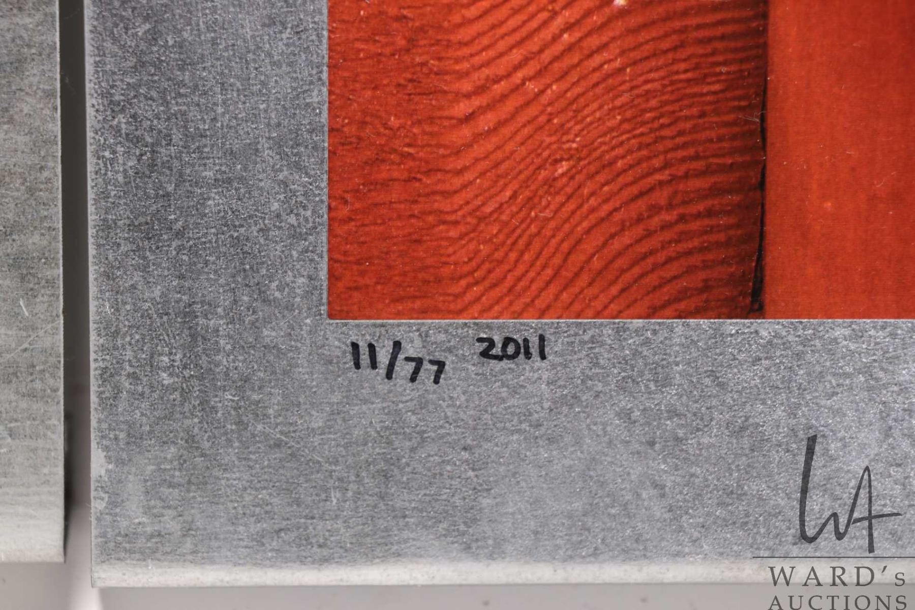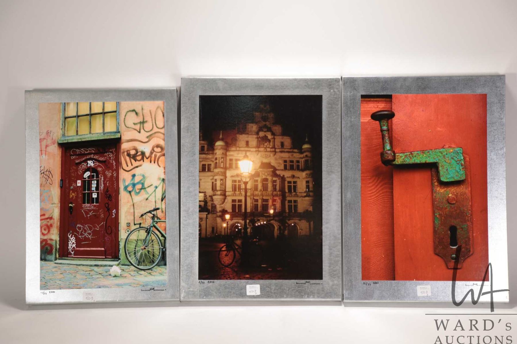 Julie Witten-Land, limited edition prints applied to formed sheet metal including " Scribble ( in Denmark) 2010, 11/17 "Past to Present" 2011, 11/77 and "Stillness Munich" 2010, 2/77, all signed by artist and each approximately 17" X 12"