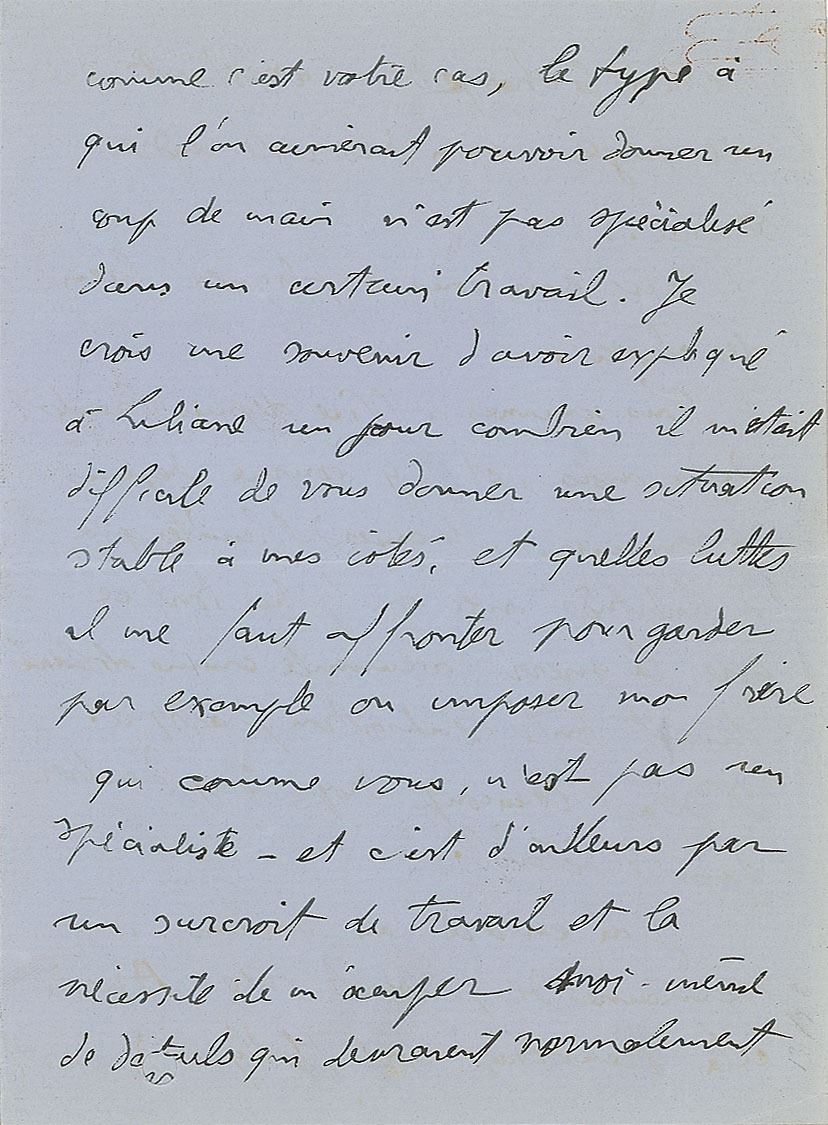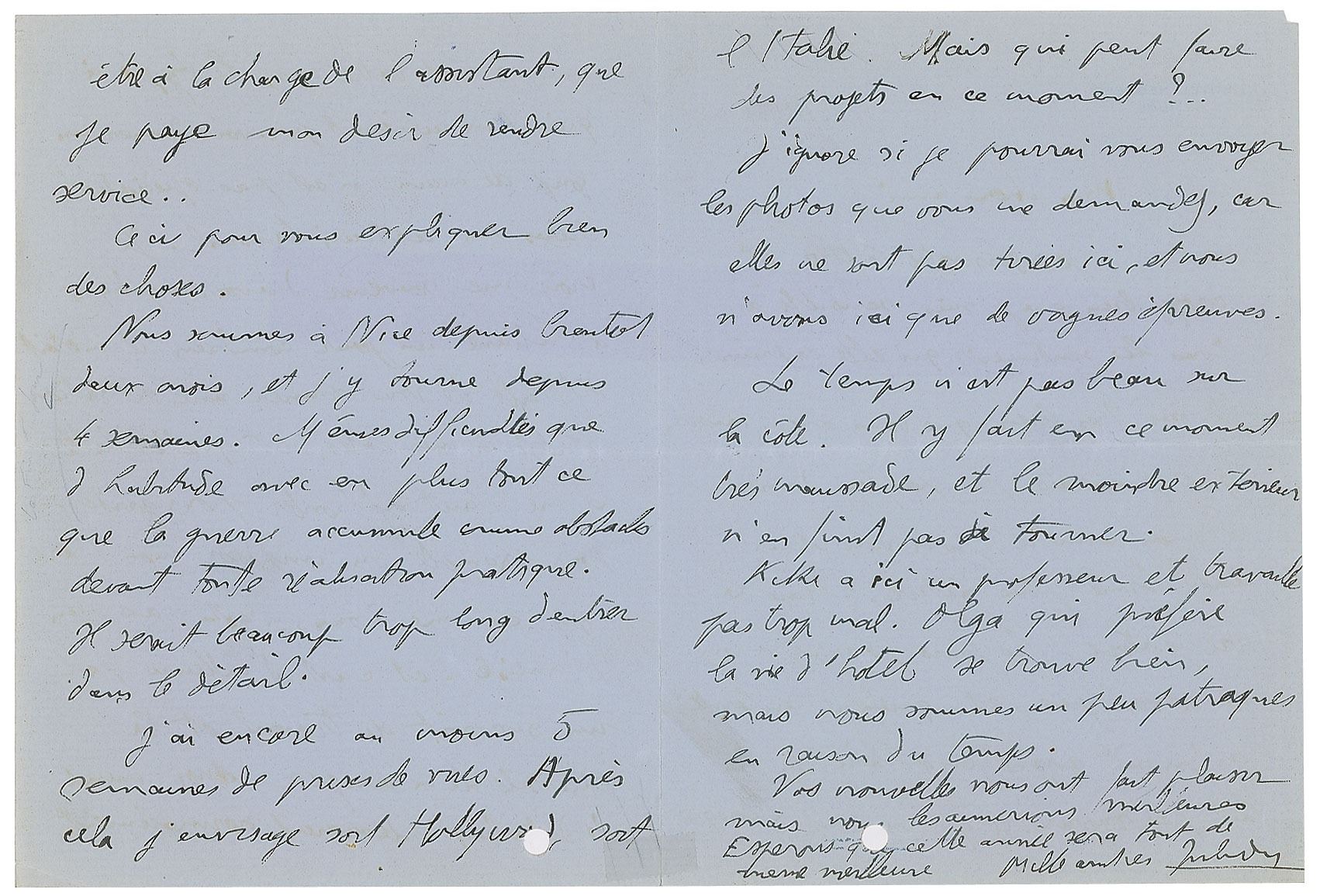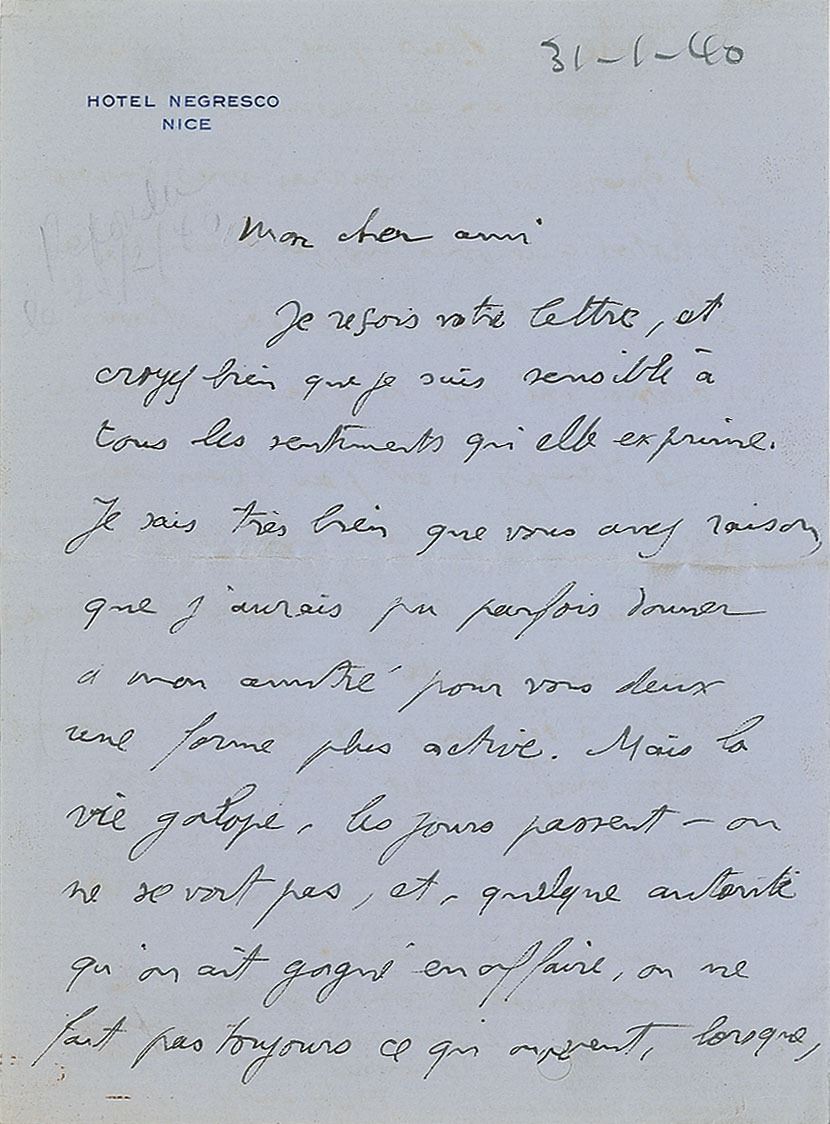 Untranslated ALS in French, four pages on two adjoining sheets, 5.25 x 7.25, Hotel Negresco (Nice) letterhead, dated in another hand to January 31, 1940. In fine condition, with a single punch hole to the bottom of each page.