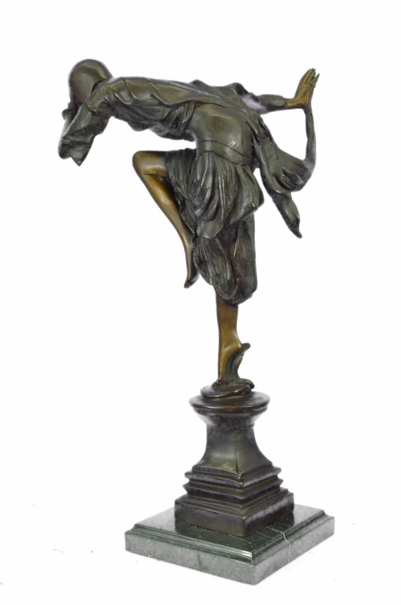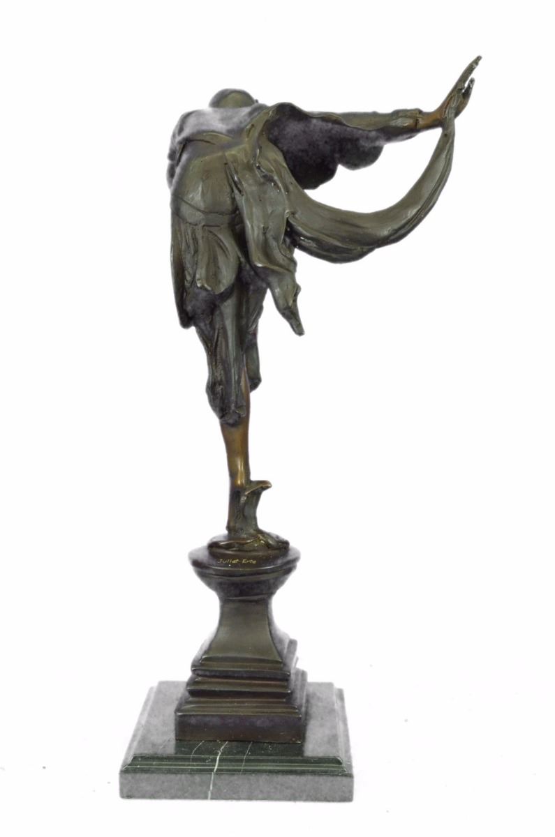 The Alluring Woman Is Captured In A Seductive Pose As She Bends Her Upper Torso, Hands Resting On Her Knees, As Her Figure Takes A L-Shape. From Her Head To Her Dainty Pointed Toes, She Wears A Strap Body Suit That Is Decorated With Beads And Sequin. The Handmade Bronze Sculpture Was Molded Using The Age-Old Method Of Lost-Wax Casting And Stained With A Brown Patina Finish For Perpetuation. She Is Mounted Upon A Black Marble Base With The Artist Juliet Signature. Bronze Dimensions With Marble Base: Height 20 X Width 11 inches. Weight: 13 Lbs.