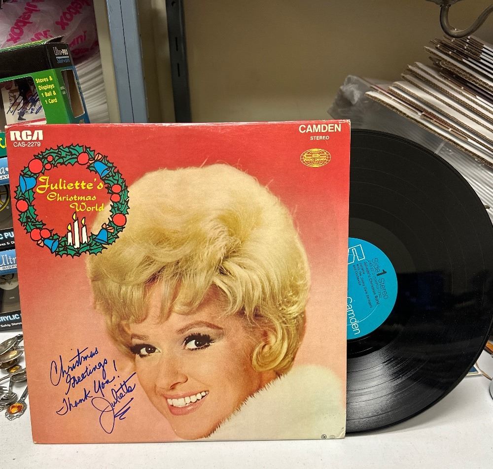 The album cover shows minor wear on the edges and corners, with some light ring wear visible. The vinyl record appears clean. The front cover is autographed.