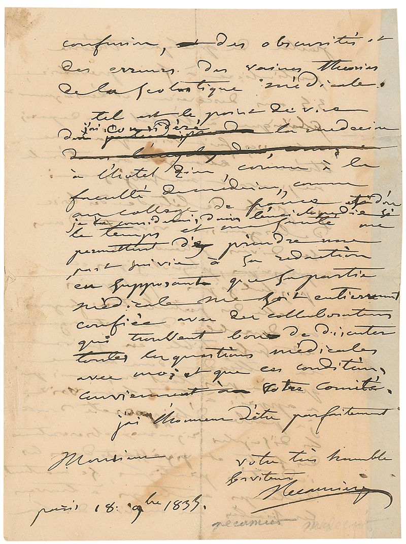 Leading French socialite (1777–1849) whose salon drew important members of Parisian society, especially in the realms of art and politics. Untranslated ALS in French, signed “Recamier,” one page both sides, 7 x 9.5, September 18, 1833. Untranslated letter in French. In very good condition, with intersecting folds, scattered creases, toning, and soiling, and an unrelated letter affixed to the left border of the front.