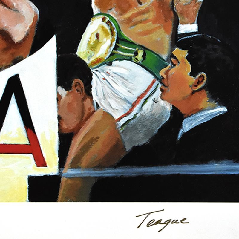 "Julio Cesar Chavez vs Oscar De La Hoya" is a limited edition lithograph on paper by Teague, numbered and Hand signed by the artist. Includes Letter of Authenticity. Measures approx. 25" x 19" (image).