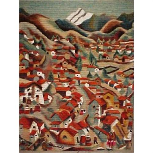 Great, large format traditional Peruvian tapestry depicting local indigenous Indian life on Peruvian mountainside by noted teacher, artist and weaver Julio Montes. His artist loomed tapestries grace the walls of the Government Palace, Congress, the Sheraton Hotel in Lima ("Macchu Pichu"), the Vatican, etc. Mr. Montes' works are hand loomed, using sheeps' wool, vegetable and German dyes...Thanks for looking...Chas.