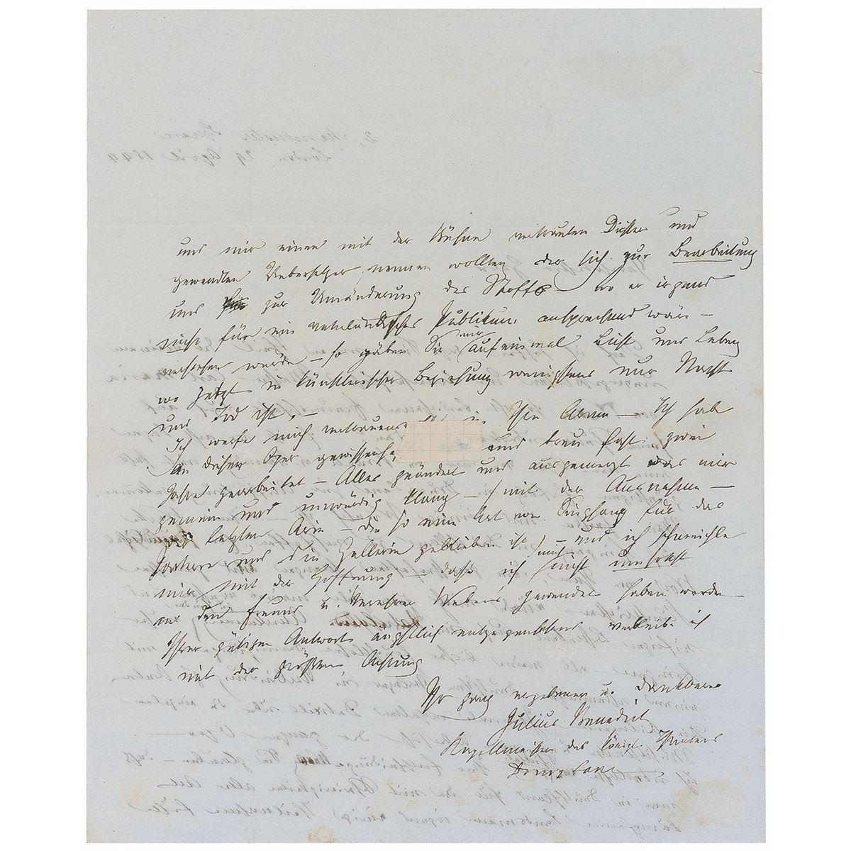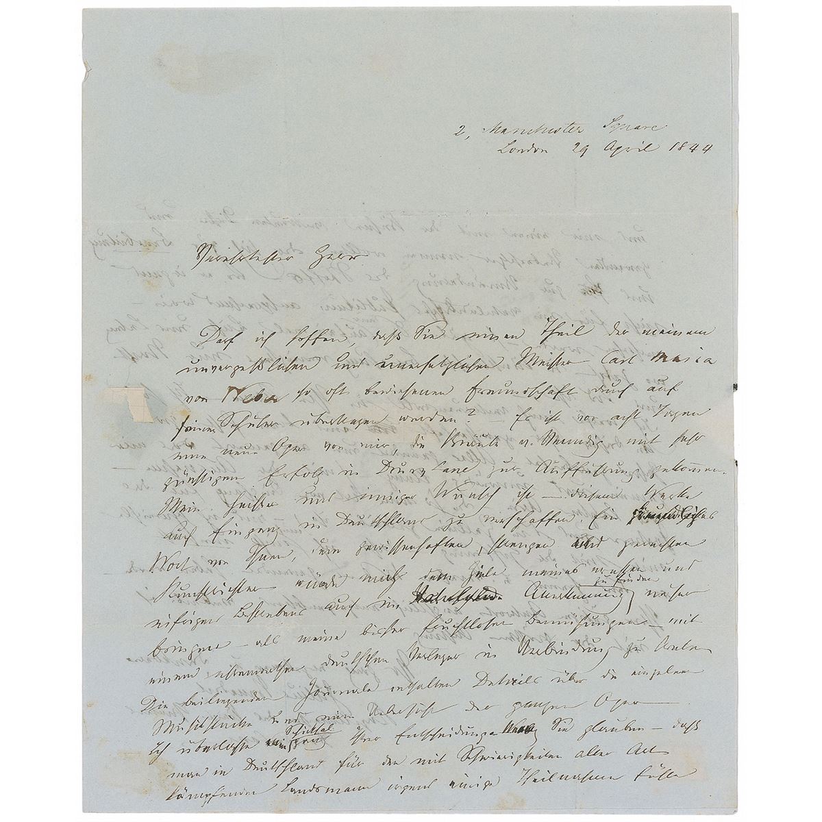 German-born composer and conductor (1804–1885). ALS in German, one page both sides, 8 x 9.75, April 29, 1844. Untranslated letter as conductor of the Royal Theatre to the poet and musicologist Ludwig Rellstab in Berlin, regarding a performance of his opera The Brides of Venice. Intersecting folds (one vertical fold passing through a single letter of the signature), a few mounting remnants (one to the center of the reverse affecting a few words), and show-through from writing to opposing sides, otherwise fine condition.
