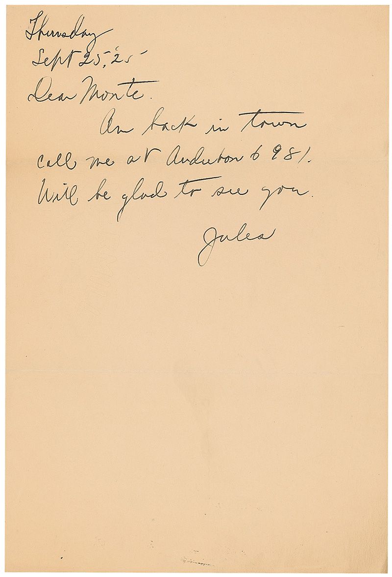 Operatic baritone (1897–1943) who came to prominence during the Harlem Renaissance, best known for his role as Joe in Jerome Kern’s Ol' Man River. Scarce ALS signed “Jules,” one page, 7 x 10.5, September 25, 1925. Letter to Montgomery Evans. In full: “Am back in town—call me at Audubon 6981. Will be glad to see you.” In fine condition, with a uniform shade of toning and tiny tear to bottom edge. Accompanied by the original mailing envelope of a different letter, filled out in Bledsoe’s hand and signed “Bledsoe” in the return address area, and a small original program for one of Bledsoe’s performances at the Fifth Avenue Playhouse.