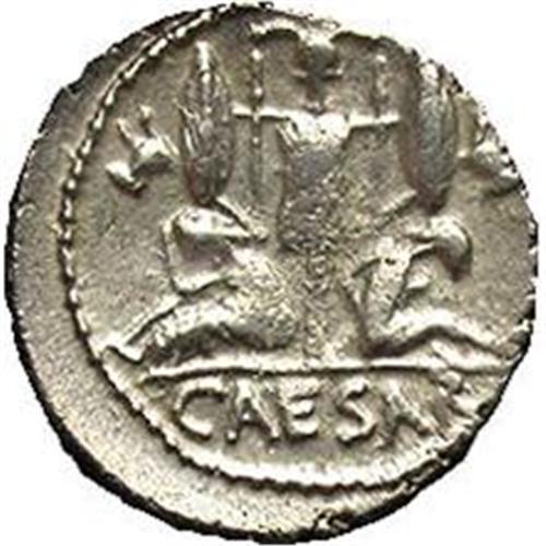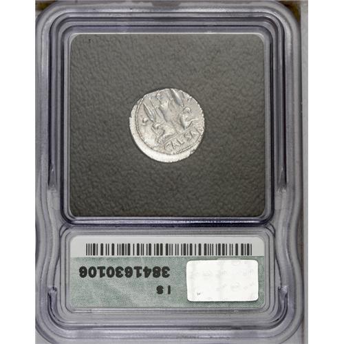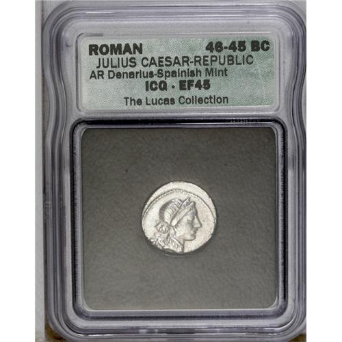 <B>Julius Caesar.</B></I> 46-45 B.C. AR denarius (17 mm). Military mint traveling with Caesar in Spain. Diademed head of Venus right; Cupid on shoulder / Trophy of Gallic arms with seated captives at either side of base. Crawford 468/1; HCRI 58; Sydenham 1014; RSC 13. XF45 ICG.