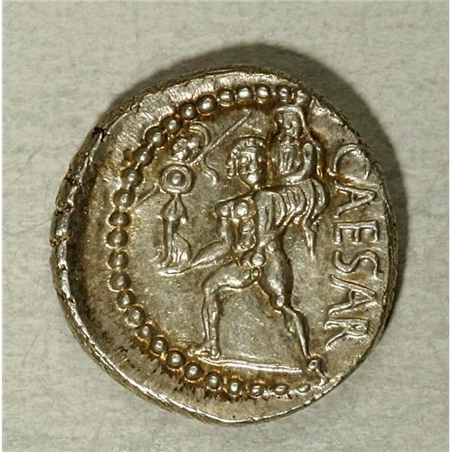 <B>Julius Caesar.</B></I> 47-46 B.C. AR denarius (17 mm, 3.85 g). Uncertain mint in Africa. Diademed head of Venus right / Aeneas advancing left, carrying Anchises and palladium. Crawford 458/1; HCRI 55; Sydenham 1013; RSC 12. <B>Good VF,</B></I> toning around the devices, a bit off center.<BR><BR><b>Shipping:</b> Coin/Currency (<a target="_blank" href="http://www.heritageauctions.com/common/shipping.php">view shipping information</a>)