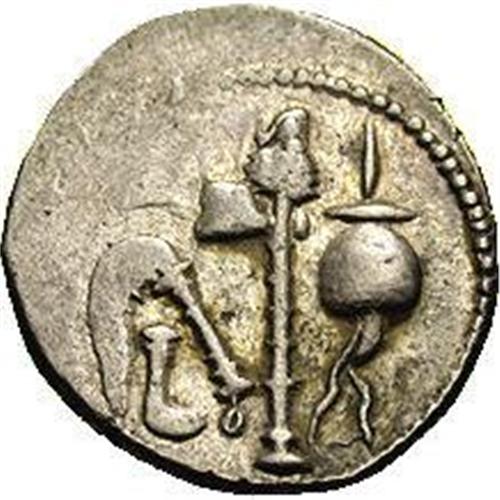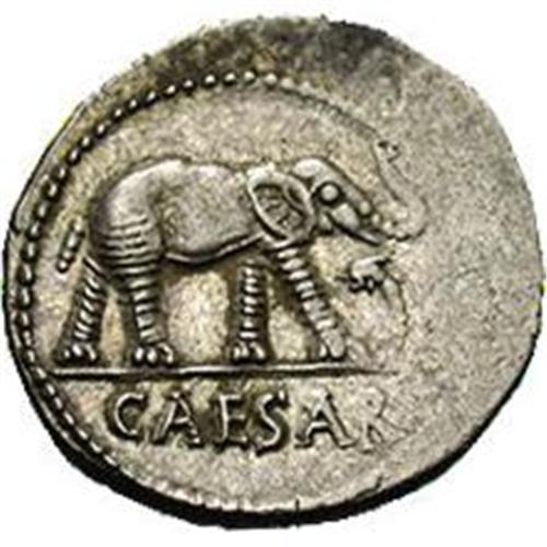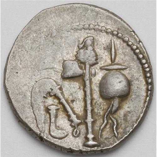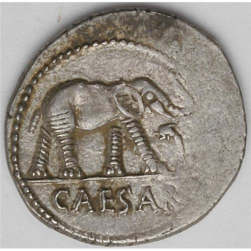 <B>Julius Caesar.</B></I> 49-48 B.C. AR denarius (18 mm, 3.67 g). Military mint traveling with Caesar. Elephant advancing right, trampling on serpent / Simpulum, aspergillum, axe, and apex. Crawford 443/1; HCRI 9; Sydenham 1006; RSC 49. VF, some flatness in strike.