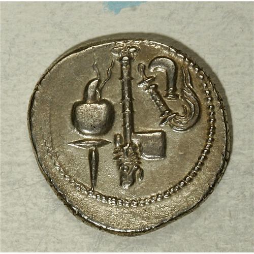 <B>Julius Caesar.</B></I> 49-48 B.C. AR denarius (18 mm, 3.80 g). Military mint traveling with Caesar. Elephant advancing right, trampling on serpent / Simpulum, aspergillum, axe, and apex. Crawford 443/1; HCRI 9; Sydenham 1006; RSC 49. <B>Good VF,</B></I> minor porosity.<BR><BR><b>Shipping:</b> Coin/Currency (<a target="_blank" href="http://www.heritageauctions.com/common/shipping.php">view shipping information</a>)