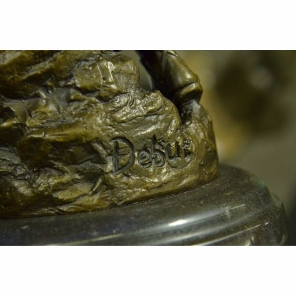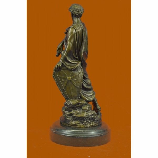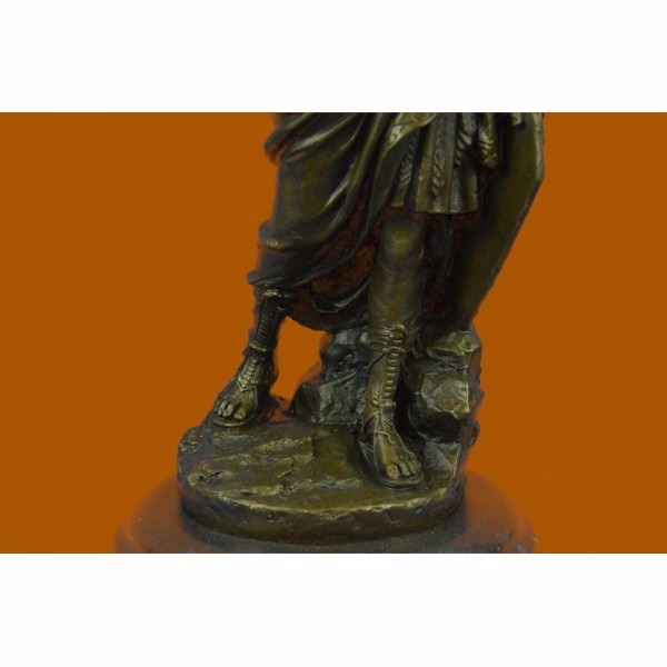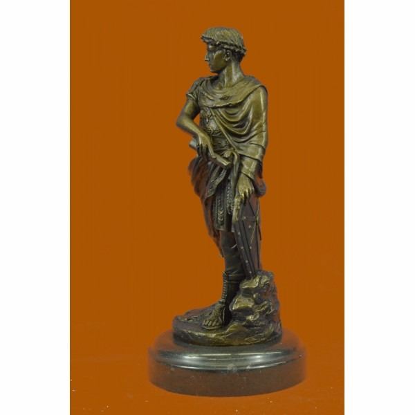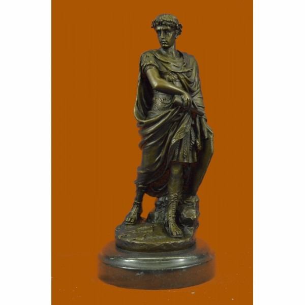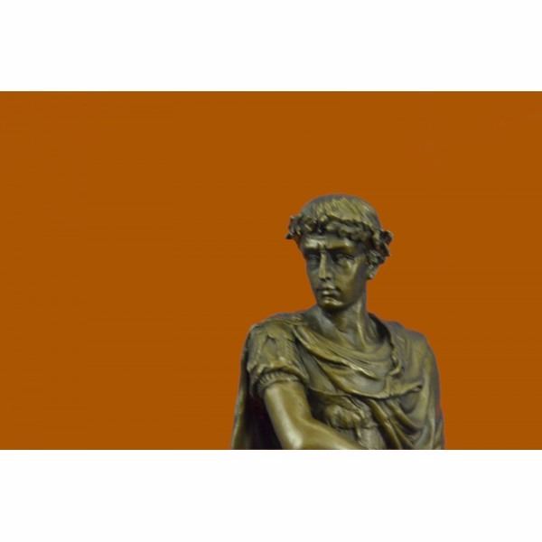 This is a bronze sculpture honoring the eminent Gaius Julius Caesar (13 July 100 BC 15 March 44 BC) who was a Roman general and statesman. He played a critical role in the gradual conversion of the Roman Republic into the Roman Empire. He began extensive reforms of Roman society and government. He centralised the bureaucracy of the Republic and was eventually proclaimed "dictator in perpetuity". He is seen here in his unrivaled power wearing a generals attire. He wears the chest armor, over what would have been, a wool tunic in a deep purple as used in martial triumphs. He holds a scepter, which is a symbolic ornamental rod or wand borne, in his left hand, significant of a ruling monarch as an item of royal or imperial insignia. His face looks out boldly to the cheering masses, raising his hand in acknowledgment. This icon of the ages was molded using the age-old methods of lost-wax casting and stained with a brown patina finish. He stands upon a black marble base with the European Bronze Finery stamp of quality and the artist J. Debut's signature. Condition: This sculpture is in perfect condition. Bronze Dimensions with Marble Base:Height 10" x Width 5" Marble Dimensions: Diameter 5" . Height without base: 9" Weight : 6 LBS Inventory 81YRD13754418