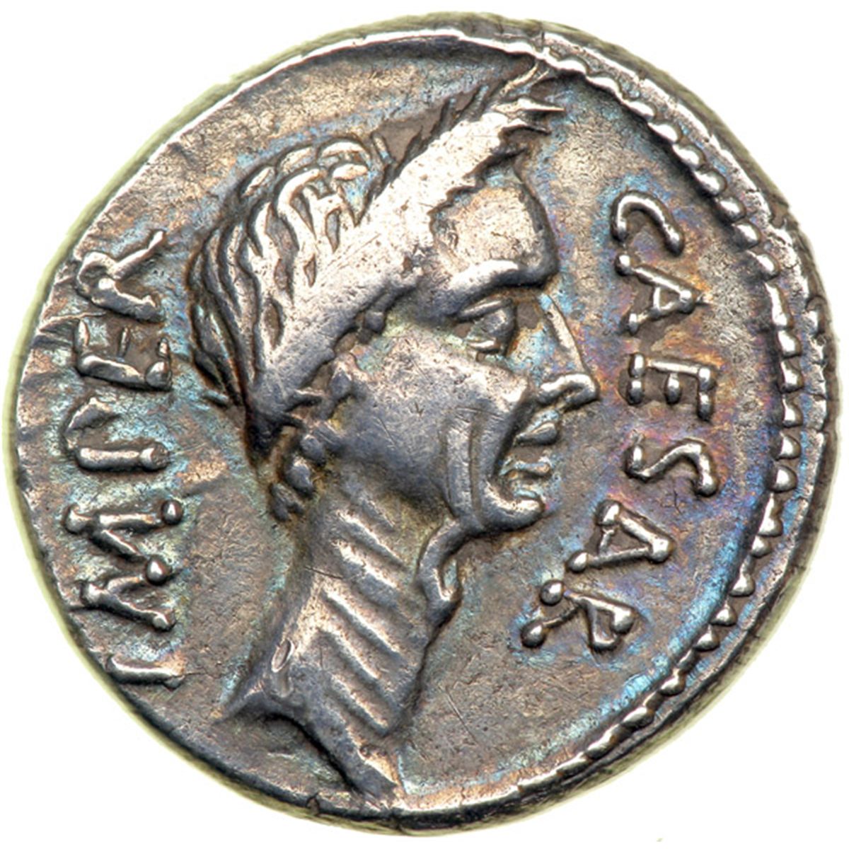 Julius Caesar, died 15 March 44 BC. AR Denarius minted at Rome by moneyer M. Mettius, late March-April 44 BC. AR Denarius minted at Rome by moneyer M. Mettius, late March-April 44 BC. Laureate head right of Caesar. Reverse: Venus standing left holding Victory and scepter, resting on shield set on globe; in lower left field, "D". Cr. 480/17; Mettia 5; S. 1055. Beautifully toned; well centered and struck. About Extremely Fine. .