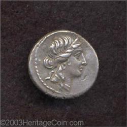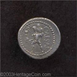 <TABLE cellSpacing=0 cellPadding=0 width="100%" bgColor=#000000 border=0><TBODY> <TR><TD width="100%"><TABLE cellSpacing=1 cellPadding=3 width="100%" border=0><TBODY><TR><TD width="100%" bgColor=#79735c><FONT face=arial color=#ffffff size=3><B>Description</B> </FONT></TD></TR><TR><TD width="100%" bgColor=#ffffff><FONT face=arial size=2><B>Julius Caesar.</B></I> 47-46 B.C. AR denarius (19 mm, 3.76 g). African mint. Diademed head of Venus right / Aeneas walking left, carrying Anchises and palladium. Crawford 458/1; HCRI 55; Sydenham 1013; RSC 12. Toned, nice VF, surfaces a touch grainy, attempted puncture on edge. </FONT></TD></TR></TBODY></TABLE></TD></TR></TBODY></TABLE><BR><A name=PricesRealized></A><TABLE cellSpacing=0 cellPadding=0 width="100%" bgColor=#000000 border=0><TBODY><TR><TD width="100%"><TABLE cellSpacing=1 cellPadding=3 width="100%" border=0><TBODY><TR><TD width="100%" bgColor=#79735c><A name=PR><FONT face=arial color=#ffffff size=3><B>Previous Prices from Heritage Auctions</B> </FONT></A></TD></TR><TR><TD bgColor=#f6f6ed>No Prior Data Recorded </TD></TR><TR><TD bgColor=#ffffff><FONT face=arial size=1 ?>PLEASE NOTE: All prices realized reflect the final hammer price PLUS the buyer's premium in auctions that charge a buyer's premium. Each item has a notation at the top of the listing indicating whether that lot included a buyer's premium. Example: A item that sells with a final hammer price of $100 and a 20% buyer's premium will display with a price realized of $120. All information listed is intended to be as accurate as possible, but errors are possible. Please use this guide carefully and inform us of any inaccuracies. </FONT></TD></TR></TBODY></TABLE></TD></TR></TBODY></TABLE><BR><TABLE cellSpacing=0 cellPadding=0 width="100%" bgColor=#000000 border=0><TBODY><TR><TD width="100%"><TABLE cellSpacing=1 cellPadding=3 width="100%" border=0><TBODY><TR><TD width="100%" bgColor=#79735c colSpan=6><FONT face=arial color=#ffffff size=3><B>Price Guide*</B> </FONT></TD></TR><TR bgColor=#f6f6ed><TD align=middle><B>Grade</B> </TD><TD align=middle><B>Coin World<BR>(Trends)</B> </TD><TD align=middle><B>Numismedia<BR>Retail</B> </TD><TD align=middle><B>Numismedia<BR>Wholesale</B> </TD><TD align=middle><B>Coin<BR>Universe</B> </TD><TD align=middle><B>Heritage<BR>Value Index</B> </TD></TR><TR bgColor=#ffffff><TD colSpan=6><FONT size=1>*All information listed is intended to be as accurate as possible, but errors are possible. No item may be returned or refused based on this information which is provided as a service to our customers. You should contact each pricing source directly to determine the accuracy of this information. </FONT></TD></TR></TBODY></TABLE></TD></TR></TBODY></TABLE><BR><TABLE cellSpacing=0 cellPadding=0 width="100%" bgColor=#000000 border=0><TBODY><TR><TD width="100%"><TABLE cellSpacing=1 cellPadding=3 width="100%" border=0><TBODY><TR><TD width="100%" bgColor=#79735c><FONT face=arial color=#ffffff size=3><B>Population Guide</B> </FONT></TD></TR><TR bgColor=#ffffff> Important notice: Heritage usually auctions material at the rate of 200-250 lots per hour. On some occasions eBay Live bid software or the Internet may not be able to keep up with the pace of the auction. We recommend placing a realistic absentee bid now as insurance to avoid disappointment. Occasionally the auctioneer may eliminate or reject an eBay Live bid, and the auctioneer may also reopen a lot after the close of the eBay live bidding (usually because we missed an audience bid), and may reject your bid even if it shows you as the winning bidder. By bidding via eBay Live, you agree that Heritage may award the lot to another bidder at its sole discretion under the circumstances described above or any other reasonable circumstances. Also please note that all Heritage lots purchased through eBay Live carry a 20% Buyer's Premium. Please make sure you read the Terms and Conditions before you bid.</TD></TR></TBODY></TABLE></TD></TR></TBODY></TABLE>