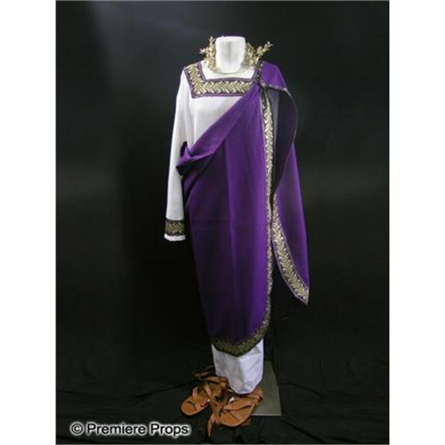 From David E. Kelley Productions - Men's Julius Caesar Costume w/ white w/ purple/gold trim at sleeves/collar l/s full length robe (size L), purple w/ gold trim cape, gold leaf headband, brown greek sandals (size 10-11)(DEK1029)