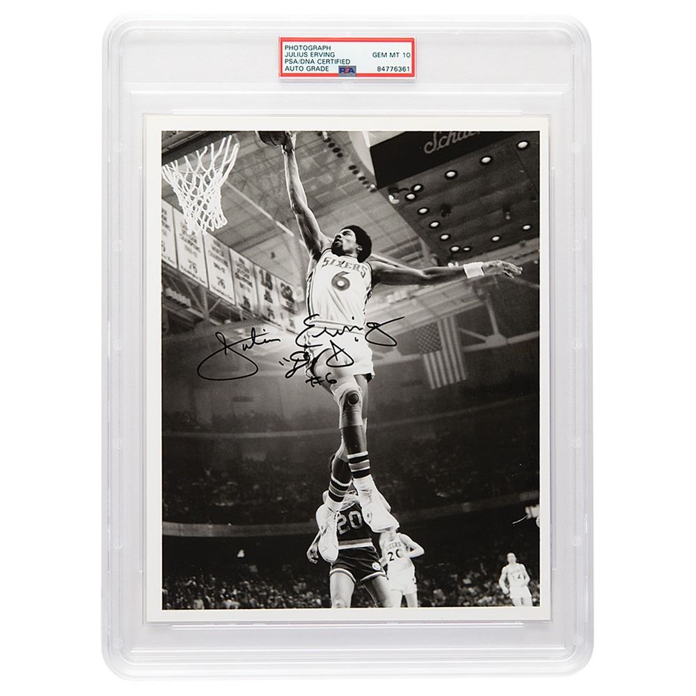 Glossy 8 x 10 photo of Erving dunking for the Sixers, signed in black felt tip, "Julius Erving, & #39;Dr. J.,& #39; #6." In very fine condition. Encapsulated and graded by PSA/DNA as "GEM MT 10."