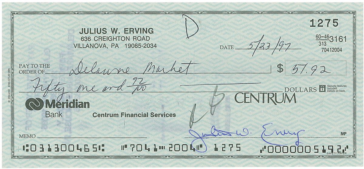 Personal check, 6 x 2.75, filled out in another hand and signed by Erving, “Julius W. Erving,” payable to Delaware Market for $57.92, May 23, 1997. In fine condition, with central vertical folds, one through first letter of signature, show-through from stamps on reverse, and a couple ink and pencil notations.