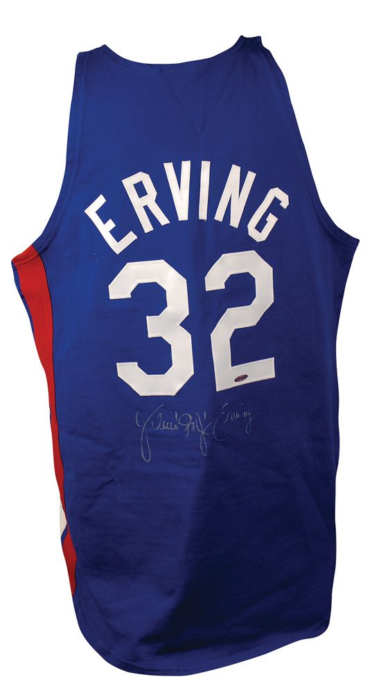 Official Mitchell & Ness Hardwood Classics replica New York Nets basketball jersey, with sewn on letters and numbers, signed in silver ink on the back, “Julius ‘Dr. J’ Erving.” In fine condition, with an Upper Deck hologram affixed to number on the back.