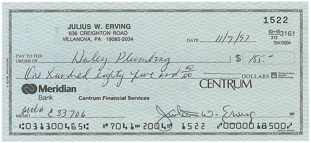 Personal check, 6 x 2.75, filled out in another hand and signed by Erving, “Julius W. Erving,” payable to Haley Plumbing for $185.00, November 7, 1997. In fine condition.