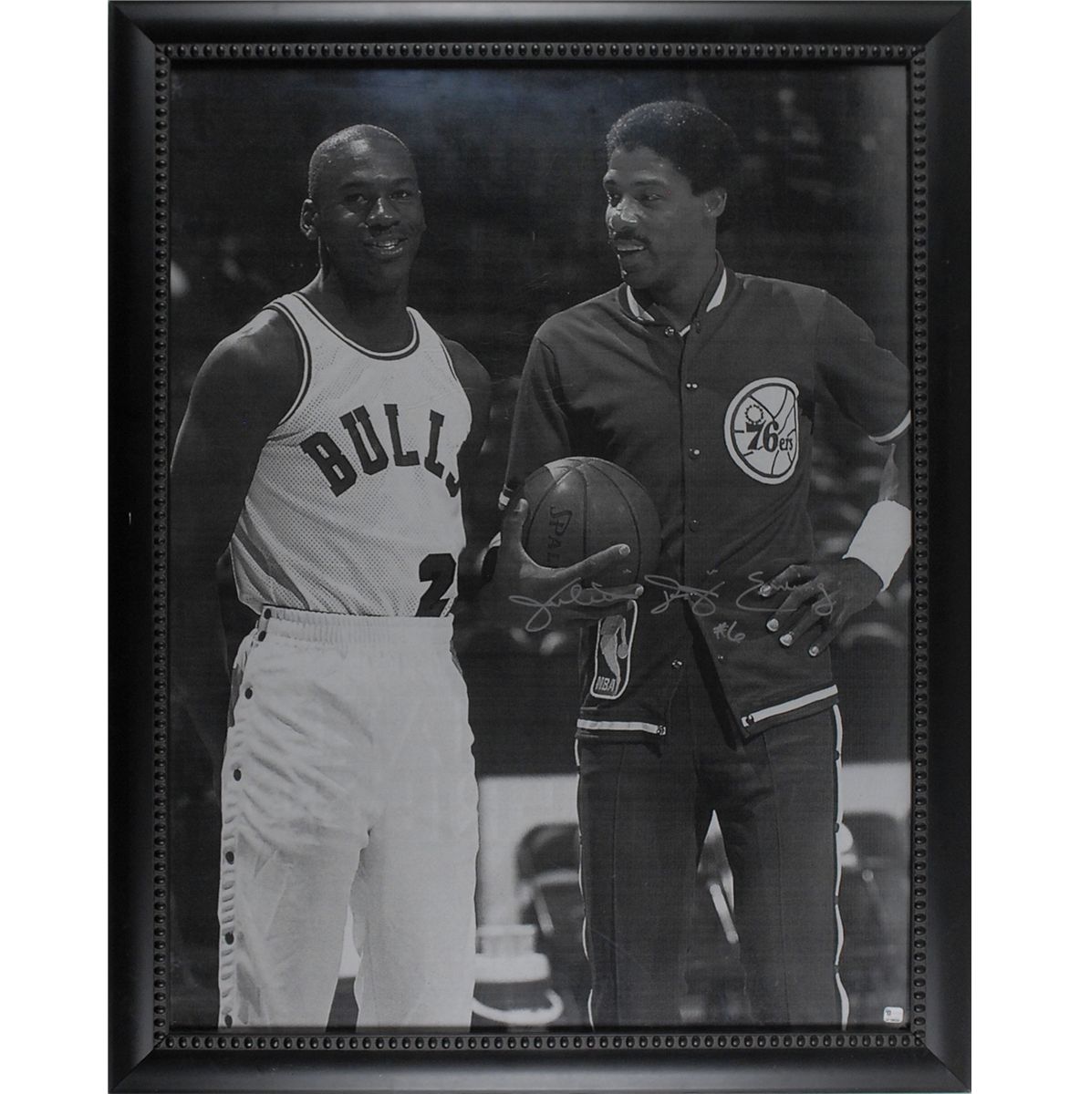 Enormous glossy 24.5 x 32.5 photo of Erving standing next to Michael Jordan, signed in silver ink, “Julius Dr. J. Erving, #6.” Framed to an overall size of 28.5 x 37. In fine condition. Oversized.