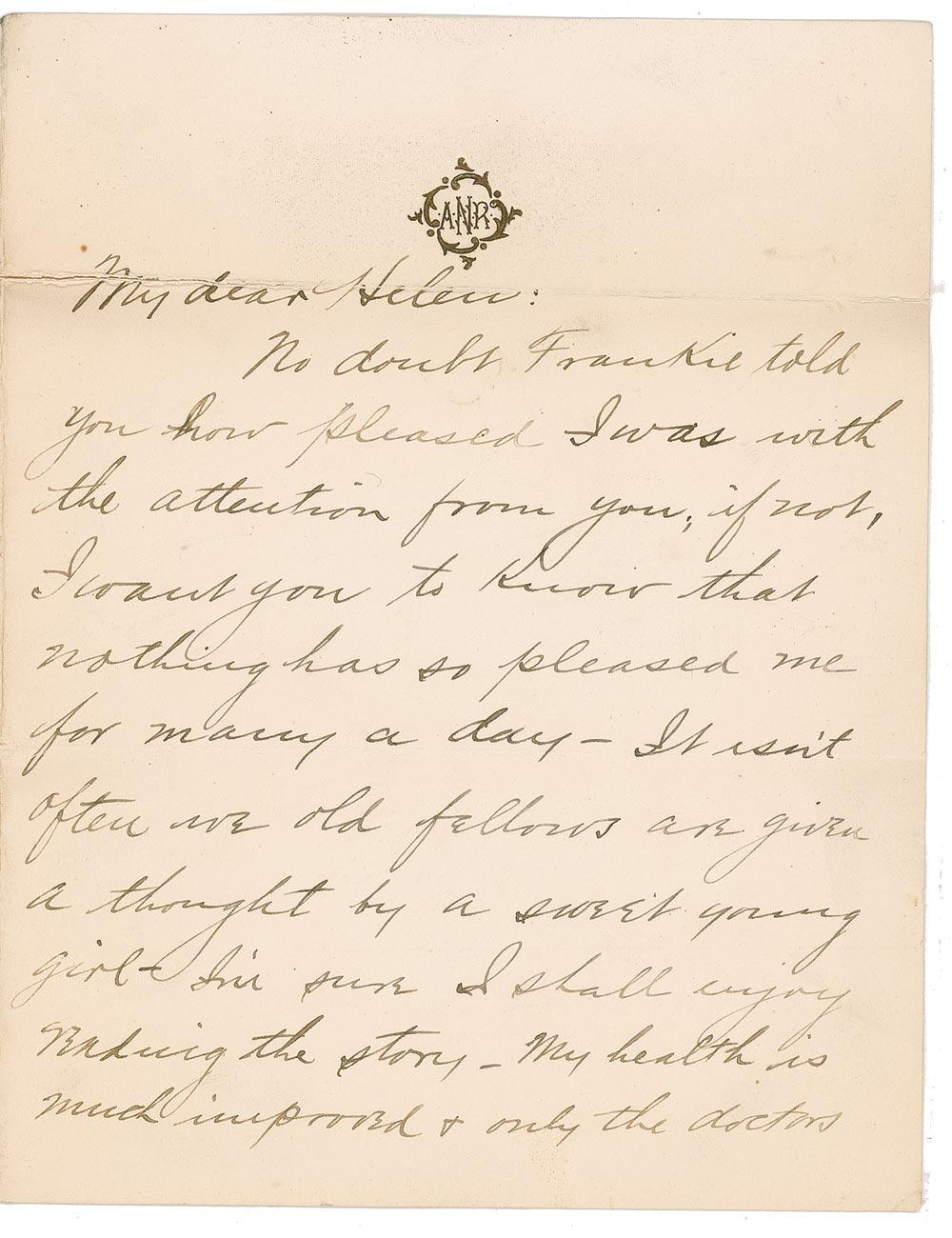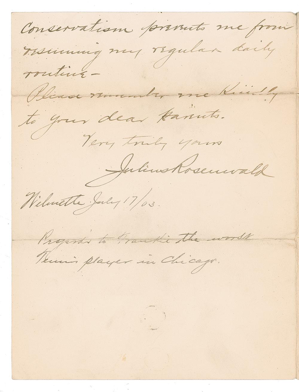 Clothier, manufacturer, and philanthropist (1862–1932) best known as a part-owner of Sears, Roebuck and Company. ALS, two pages on two adjoining sheets, 5.5 x 7, July 17, 1903. “No doubt Frankie told you how pleased I was with the attention from you; if not, I want you to know that nothing has so pleased me for many a day—It isn’t often we old fellows are given a thought by a sweet young girl—I’m sure I shall enjoy reading the story—My health is much improved & only the doctors conservatism prevents me from resuming my regular daily routine.” He has added the humorous postscript: “Regards to Frankie the worst tennis player in Chicago.” Few creases, a partial separation along a top mailing fold, and light soiling, otherwise fine condition.