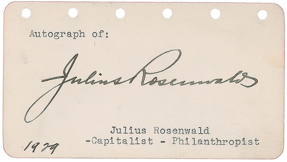 Clothier, manufacturer, and philanthropist (1862–1932) best known as a part-owner of Sears, Roebuck and Company. Vintage fountain pen signature, “Julius Rosenwald, 1929,” on an off-white 4.5 x 2.5 page. In fine condition.