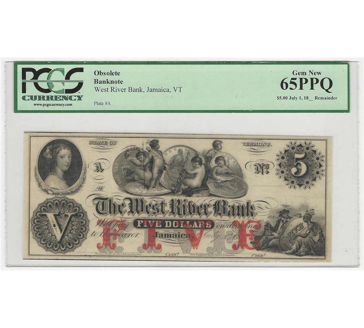 One July 1, 1800s $5 West River Bank Obsolete Bank Note PCGS 65PPQ. PCGS Graded.