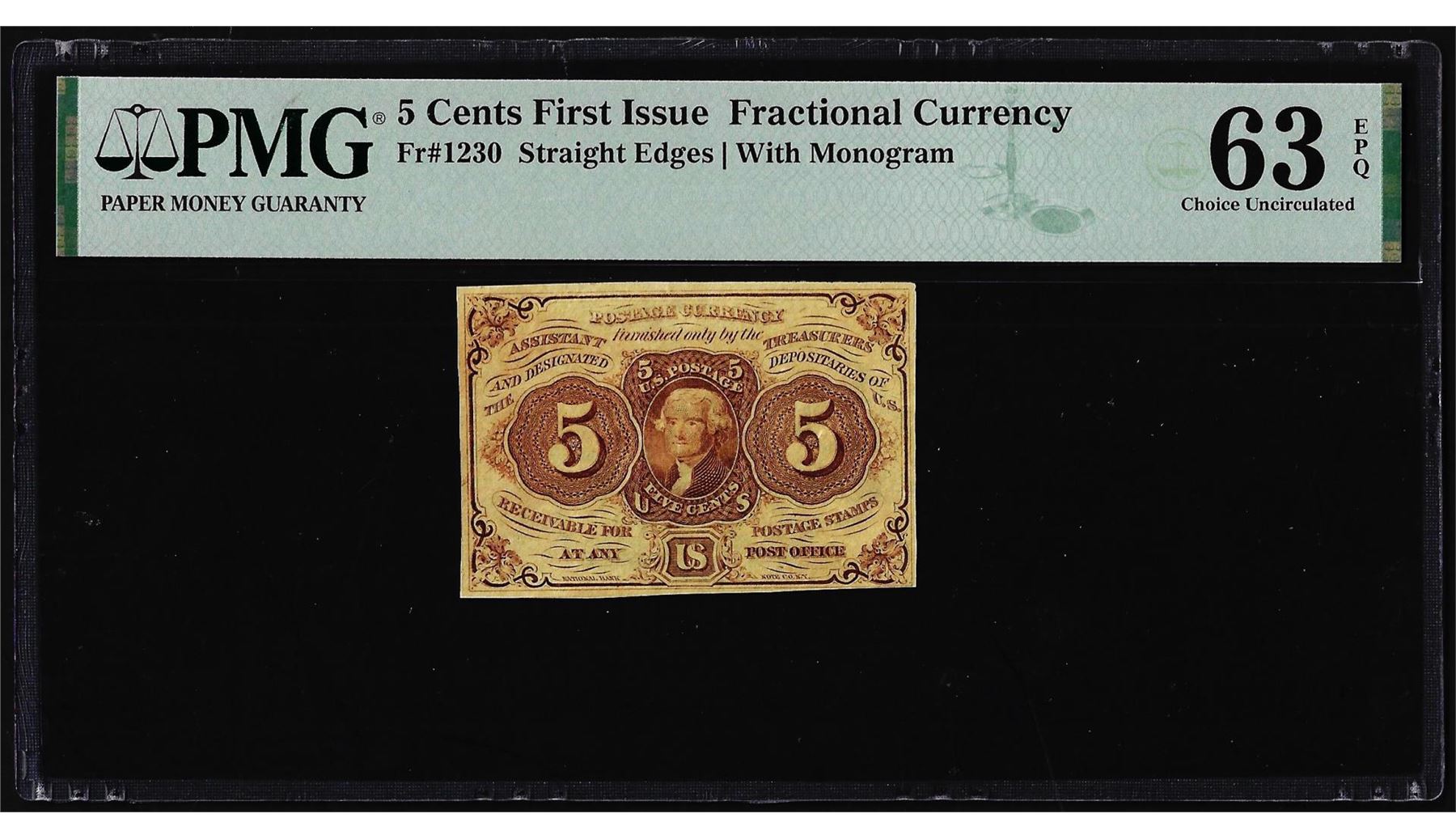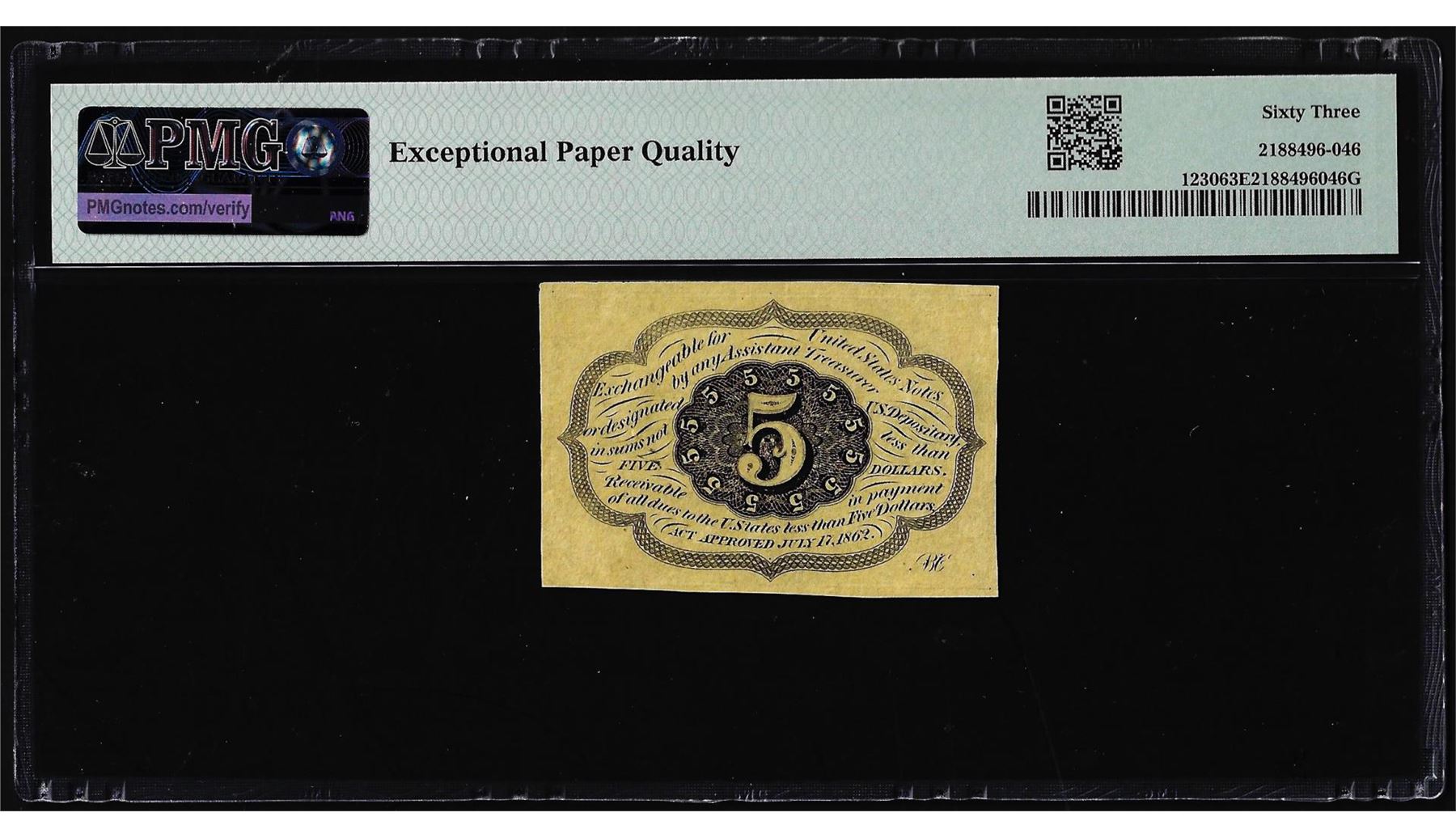 One July 17, 1862 First Issue 5 Cents Fractional Note Fr.1230 PMG Ch. Uncirculated 63EPQ. PMG Certified.