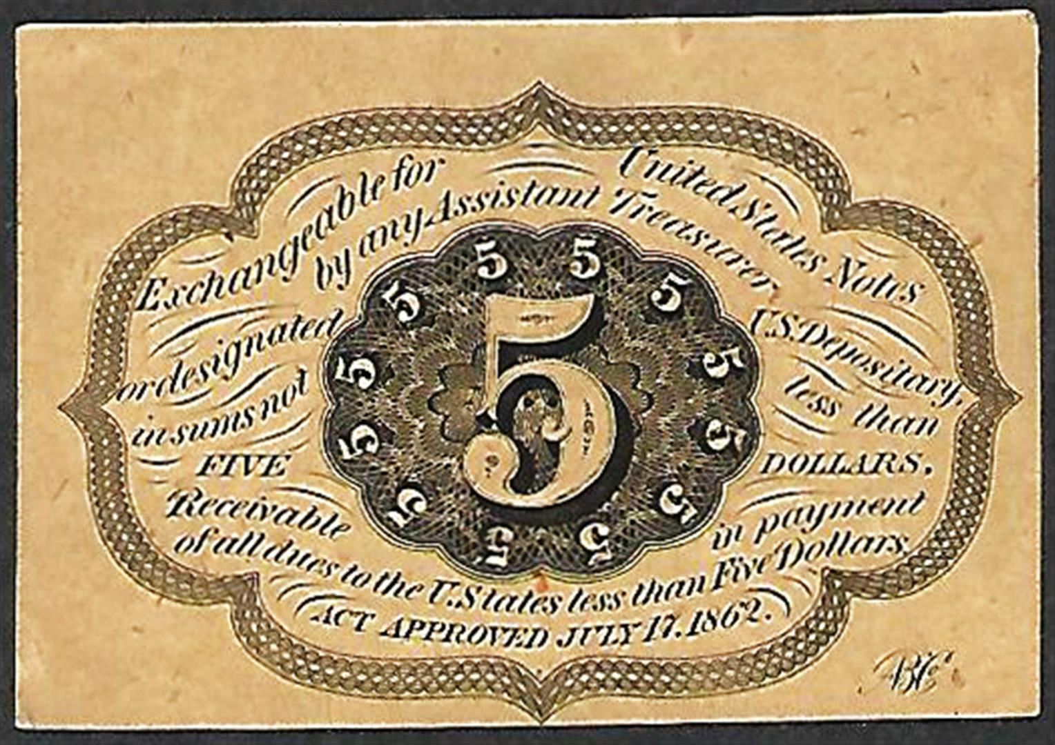 One July 17, 1862 First Issue Five Cents Fractional Currency Note.
