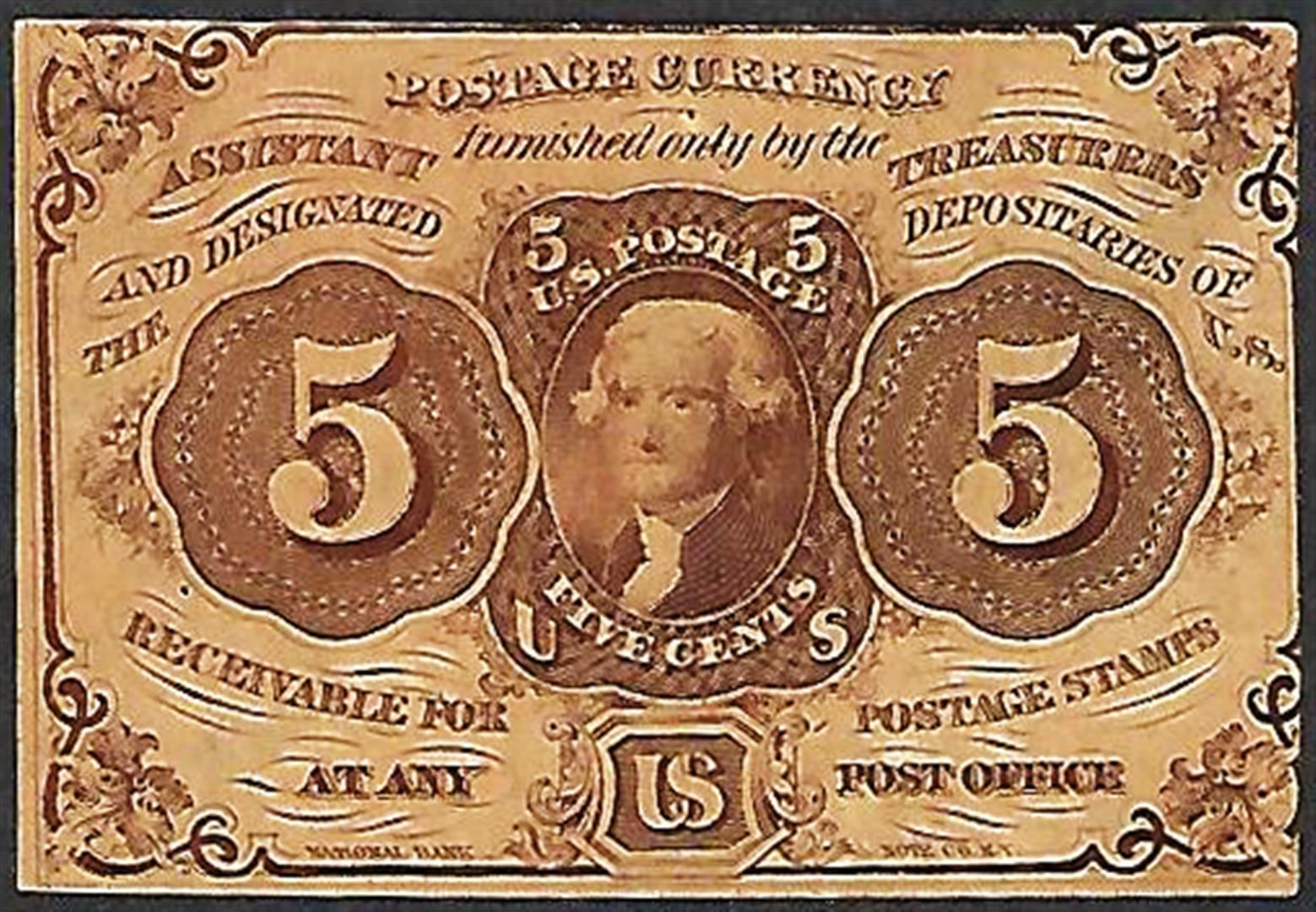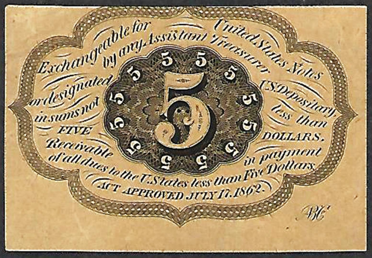 One July 17, 1862 First Issue Five Cents Fractional Currency Note.