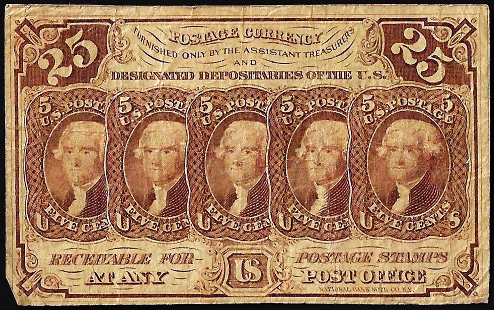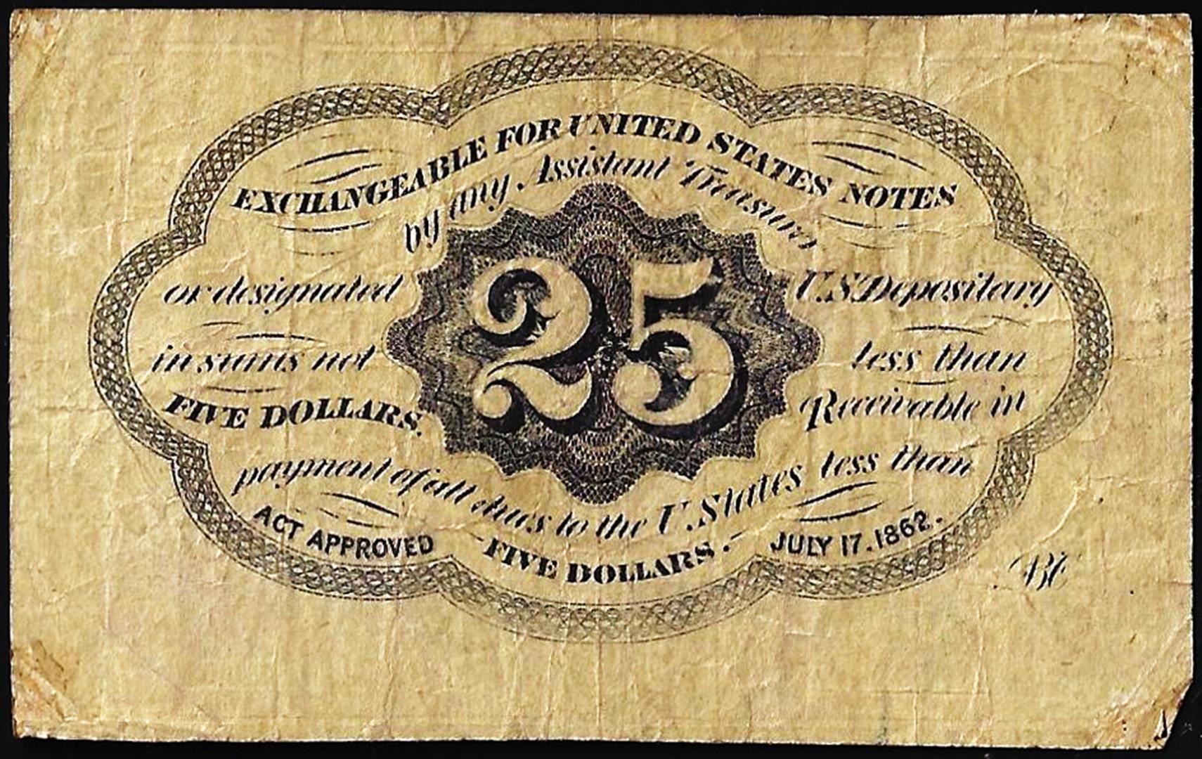 One July 17, 1862 First Issue Twenty-Five Cents Fractional Currency Note.