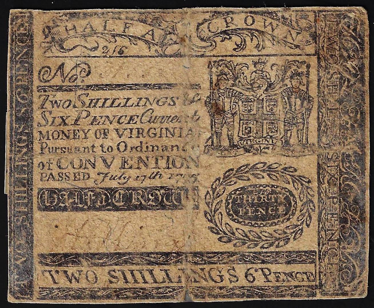 One July 17th, 1775 Virginia Two Shillings 6 Pence Colonial Currency Note.