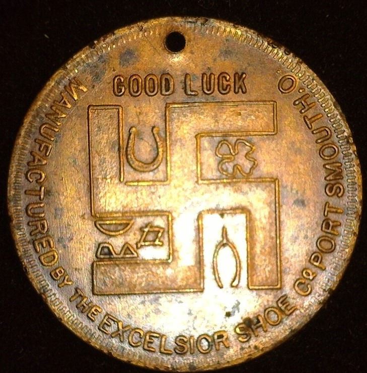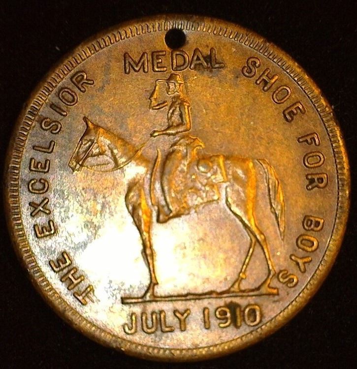 July 1910 "The Excelsior Shoe For Boys Medal", Equestrian design, holed, 'Swatika' reverse, EF.