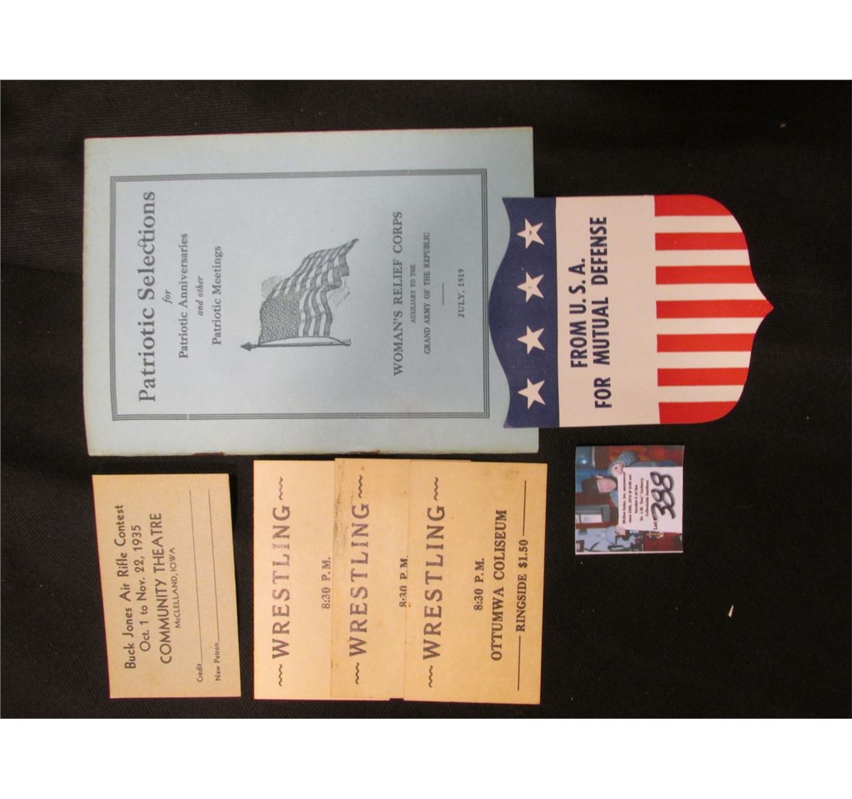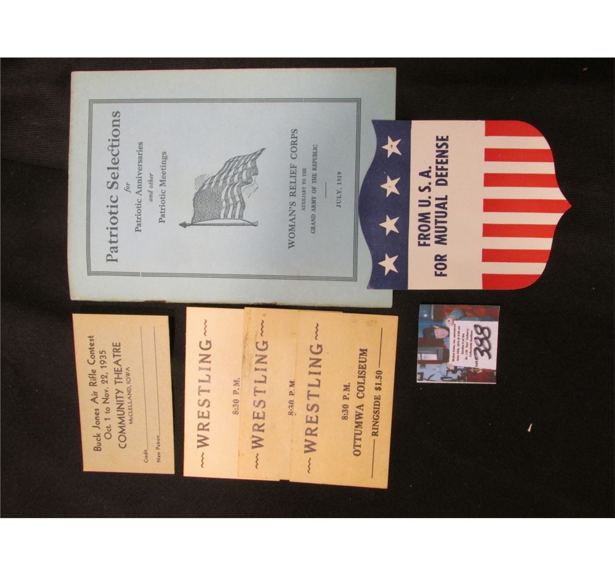 July, 1919 "Patriotic Selections for Patriotic Anniversaries and other Patriotic Meetings Woman's Relief Corps Auxiliary to the Grand Army of the Republic" Booklet; paper label "From U.S.A. For Mutual Defense" designed like a shield; (3) Admission Tickets "Wrestling 8:30 P.M. Ottumwa Coliseum Ringside $1.50"; & "Buck Jones Air Rifle Contest Oct. 1 to Nov. 22, 1935 Community Theatre McClelland, iowa" Tickets.