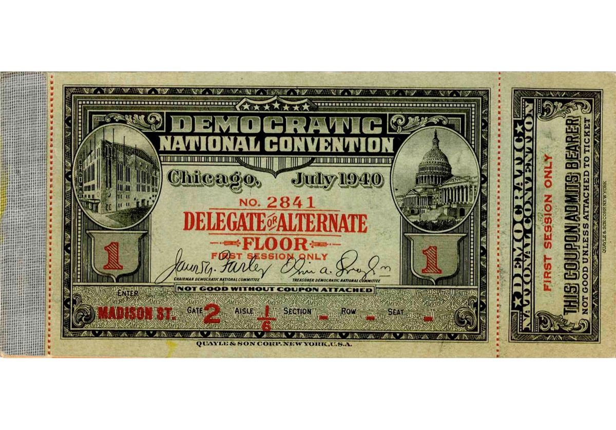 July 1940 United States Democratic National Convention in Chicago, ''Delegate or Alternate'' floor ticket. Convention took place in the midst of Franklin D. Roosevelt's three-term presidency. Vignettes on face of full ticket includes the Capitol Dome. Ornate vignette design on verso. Printing sharp and legible. Ticket, measuring 5.75'' x 3'', remains in excellent condition with only slight discoloration in places. Near fine.