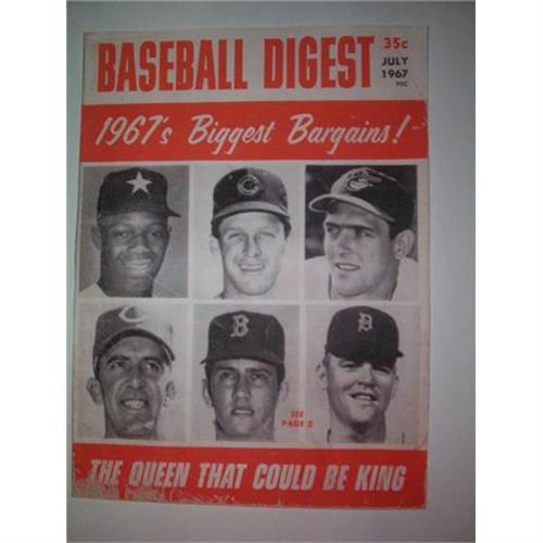 July 1967 Issue Of "Baseball Digest" Magazine. This is in FAIR CONDITION with some soiling, a tight binding, and no missing pages. All the pages have significant foxing, and some are slightly frayed around the edges. Both covers have some stains, and are slightly faded and scratched (the front cover more than the back one). They also have fold marks across the outside corners. The binding and both the covers each have some minor tears, and are slightly frayed around the edges. There are 98 pages of text that include dozens of stories by the best sports writers of that time. Some of the featured players are names like Mel Queen Jr., Don Cardwell, Cesar Tovar, Paul Blair, Reggie Smith, Deron Johnson, and others. Also included is the "Official Revised Rosters and Data Player's Numbers" for both leagues.