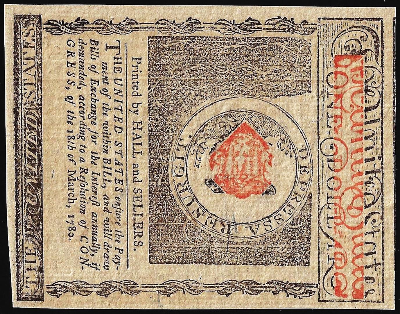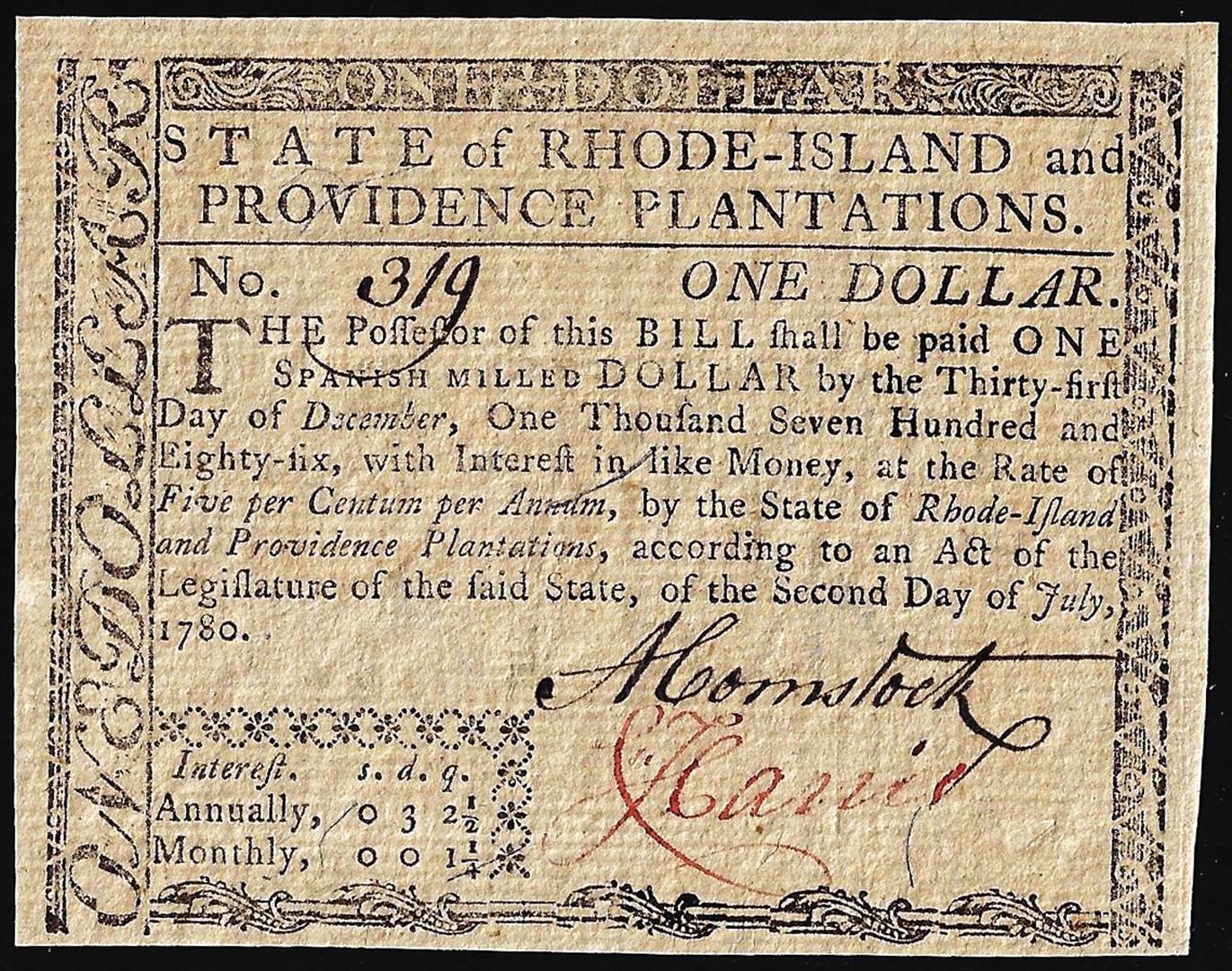 One July 2, 1780 $1 Rhode Island Colonial Currency Note.
