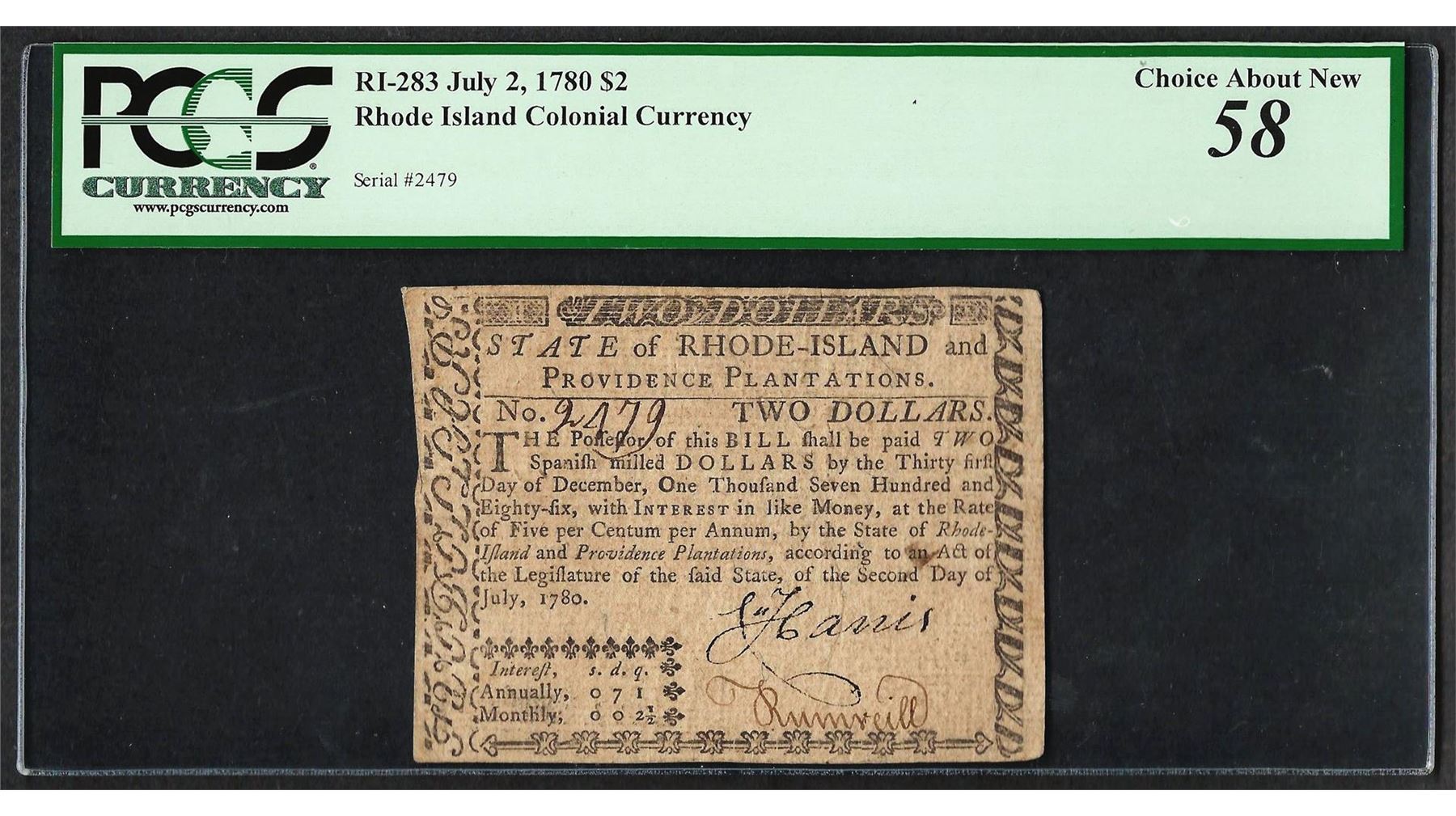 One July 2, 1780 $2 Rhode Island Colonial Currency Note RI-283 PCGS Choice About New 58. PCGS Graded.